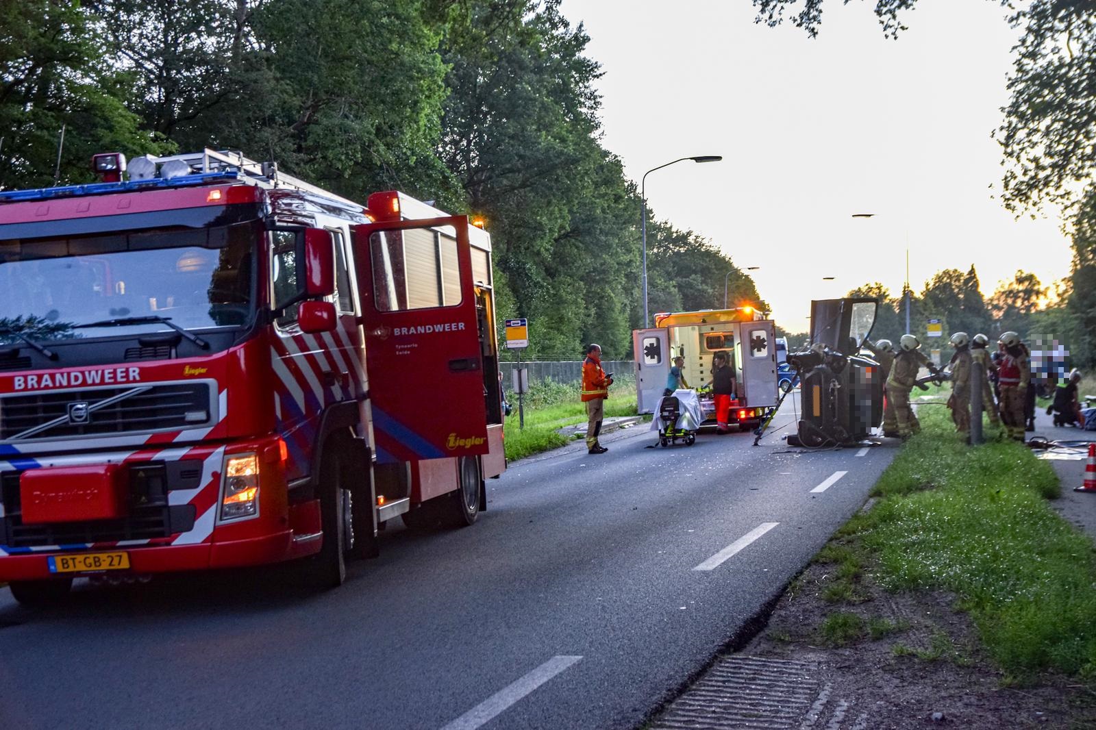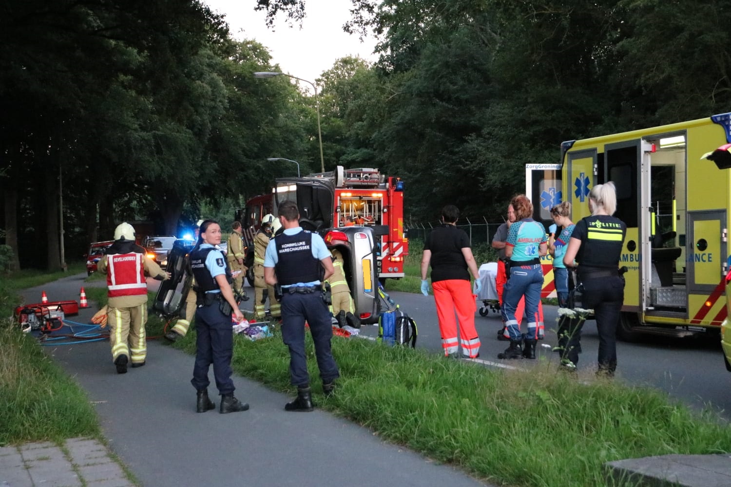 Het ongeluk gebeurde rond 21.10 uur. “Het gaat om een eenzijdig verkeersongeluk”, vertelt Ten Cate. “De auto is door onbekende oorzaak op zijn kant beland. De bestuurder is daarbij bekneld komen te zitten.” De hulpdiensten rukten massaal uit. “Het MMT, het Mobiel Medisch Team, is ter plaatse. Zij ondersteunden de verpleegkundigen van een ambulance. De politie heeft de weg afgesloten en de brandweer van Eelde is ter plaatse. De brandweerlieden proberen met redgereedschappen de bestuurder uit zijn benarde positie te bevrijden.”