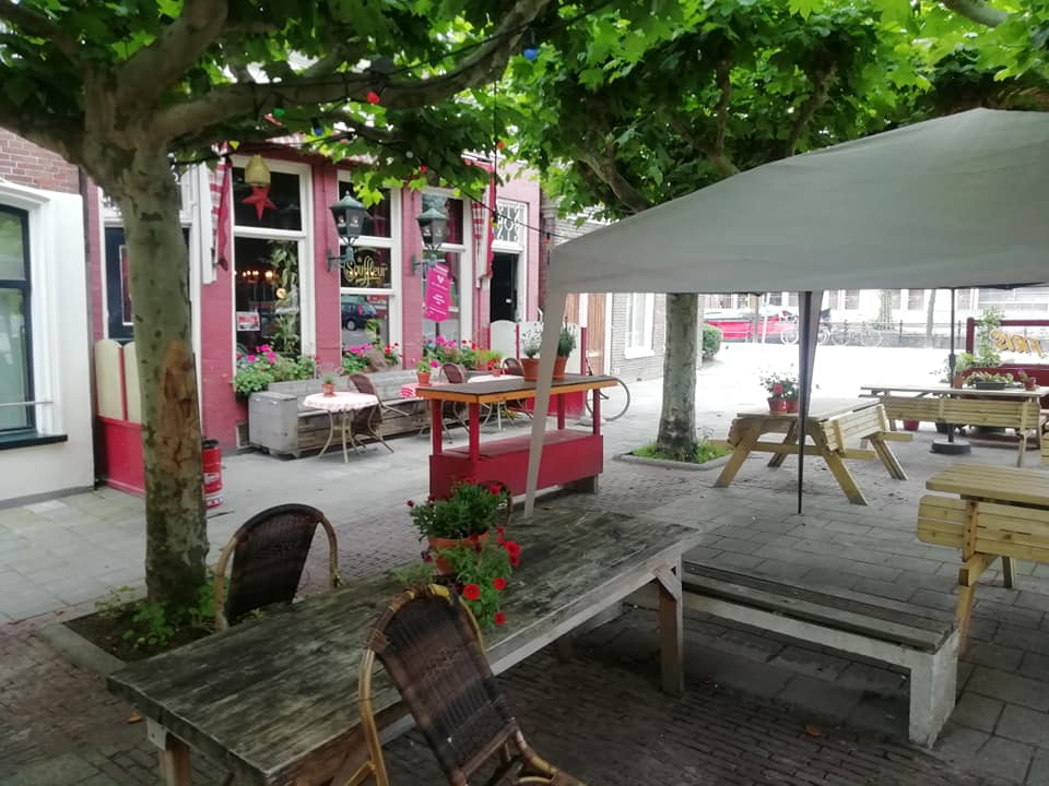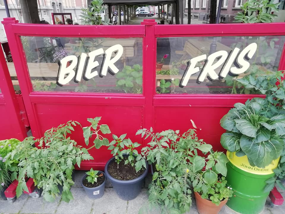 Voor het café is vanwege de coronacrisis een terras opgebouwd met daaromheen allemaal bakken en potten waar groenten groeien en bloeien. “Het is ontstaan toen de coronacrisis op haar hoogtepunt was”, vertelt eigenaresse Annemiek Meijer van het café. “Vanaf halverwege maart moesten we noodgedwongen de deuren dicht houden en toen dachten we ‘wat moeten we nou’? We zijn toen op een gegeven moment een terras gaan bouwen met daaromheen bakken waar we aarde en potgrond in hebben gestopt. Daarbij hebben we ook handig gebruik gemaakt van de platanen die voor onze zaak staan. En inmiddels groeit en bloeit er van alles.”