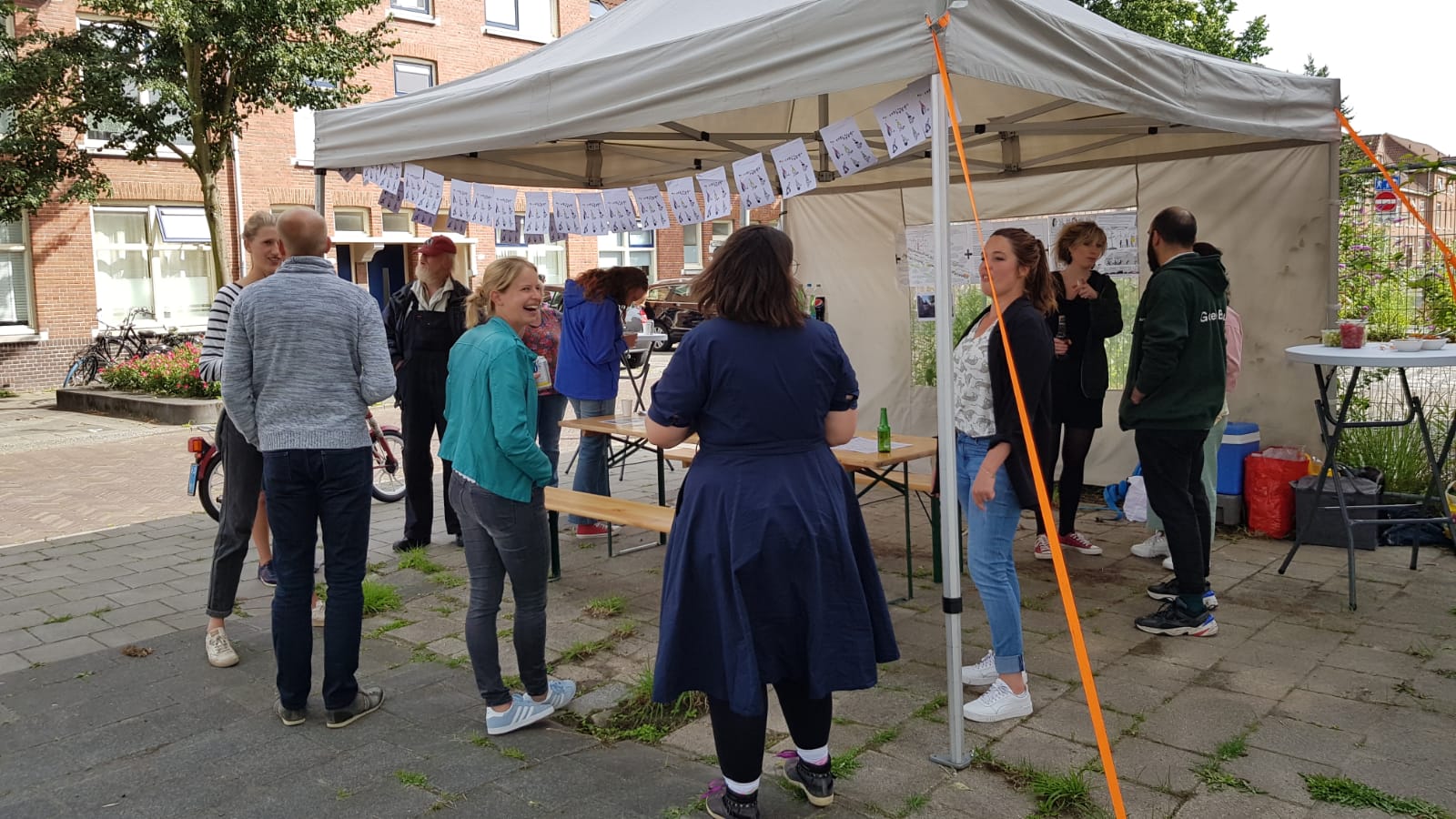 De borrel vindt plaats op de hoek van de Bedumerstraat met de Asingastraat op de locatie waar vroeger café De Deugniet was gevestigd. “We hebben eerder deze week flyers uitgedeeld in de wijk”, vertelt Ronald Nuiver van Goeiebuurt. “Het idee was om mensen samen te laten komen en onder het genot van een borrel na te denken hoe de wijk verbeterd kan worden.” De opkomst is woensdag bemoedigend. “Ja, ik denk dat er hier zo’n twintig bewoners rondlopen, dus dat is helemaal super.”