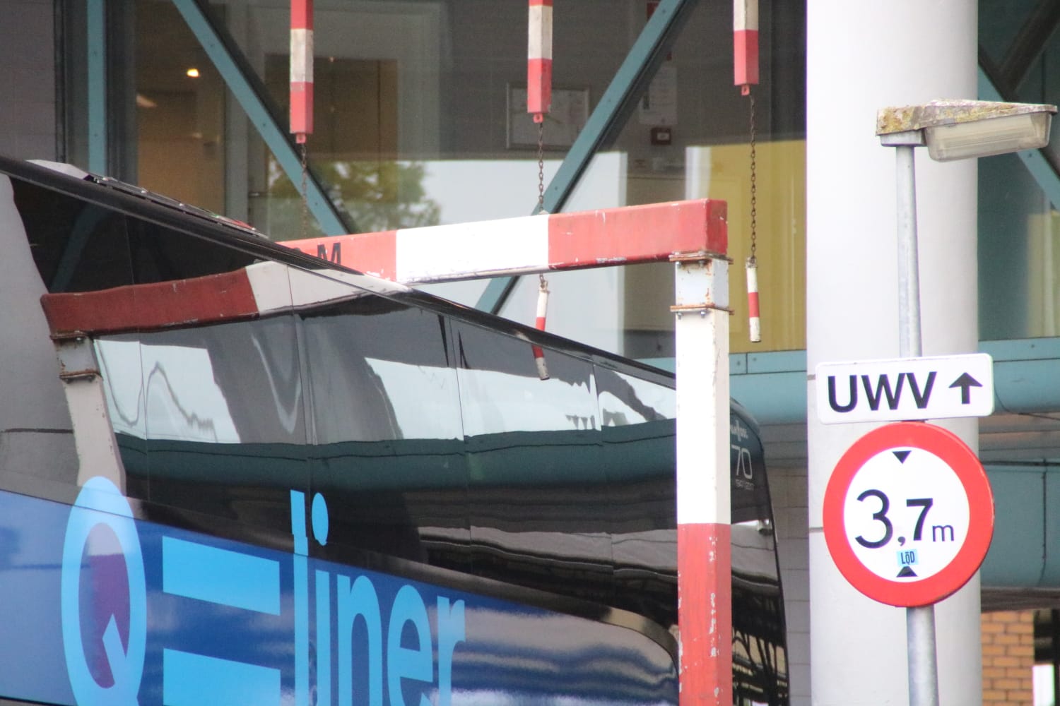 Een dubbeldekker-lijnbus van Qbuzz heeft zich donderdagochtend klem gereden onder een hoogteboog bij het Hoofdstation.