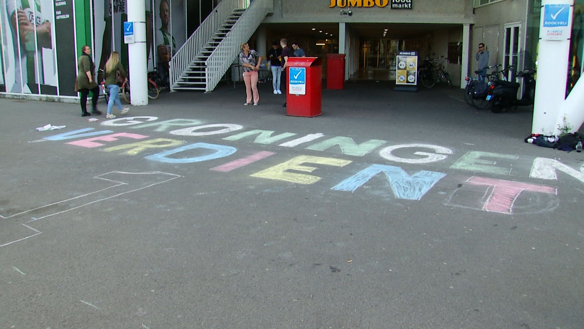 Bij de Jumbo voor de Euroborg werd woensdag actiegevoerd voor een minimum uurloon van veertien euro. Vakbond FNV en andere belanghebbende partijen tekenden met stoepkrijt ‘Groningen verdient 14’ bij de ingang van de Euroborg.