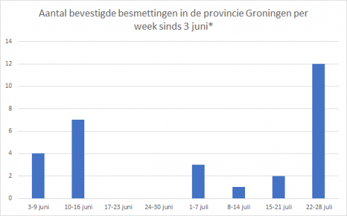 Uit gegevens van het RIVM blijkt dat het aantal positieve gevallen vooral te herleiden is naar de gemeente Groningen. Sinds 15 juli zijn er in de gemeente Groningen acht mensen positief getest, in het Westerkwartier 1, Het Hogeland 1, Midden-Groningen 2 en Westerwolde 1. In de overige gemeenten zijn sinds 15 juli geen personen positief getest.