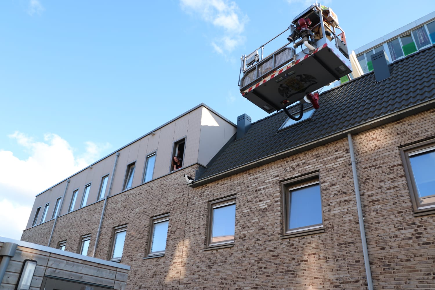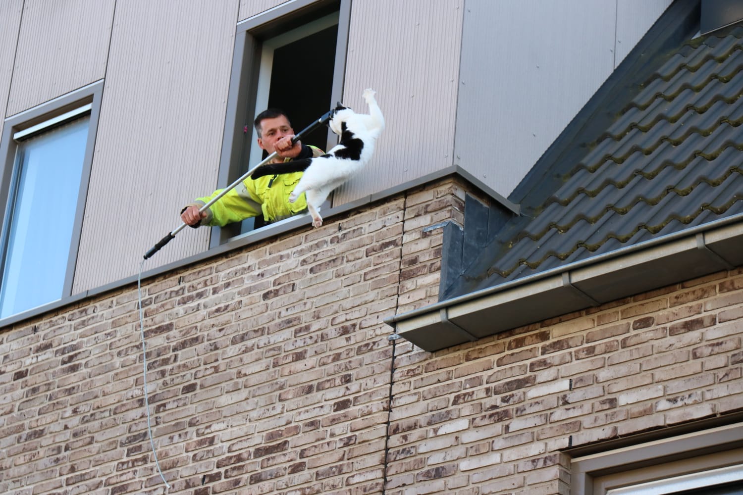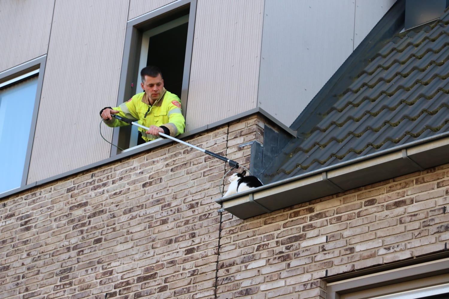 De melding kwam rond 19.10 uur binnen waarop een hoogwerker ter plaatse werd gestuurd. “Het gaat om een kat die op het dak zit”, vertelt Wind. “Het dier kan er met geen mogelijkheid af komen, daarom werden de hulpdiensten gebeld.” De hoogwerker werd daarop in positie gebracht maar al snel werd duidelijk dat de hoogwerker er niet goed bij kon. “Een brandweerman is daarop met een vangstok de woning ingegaan. Via een geopend raam kon met behulp van de stok de kat naar binnen worden getrokken.”