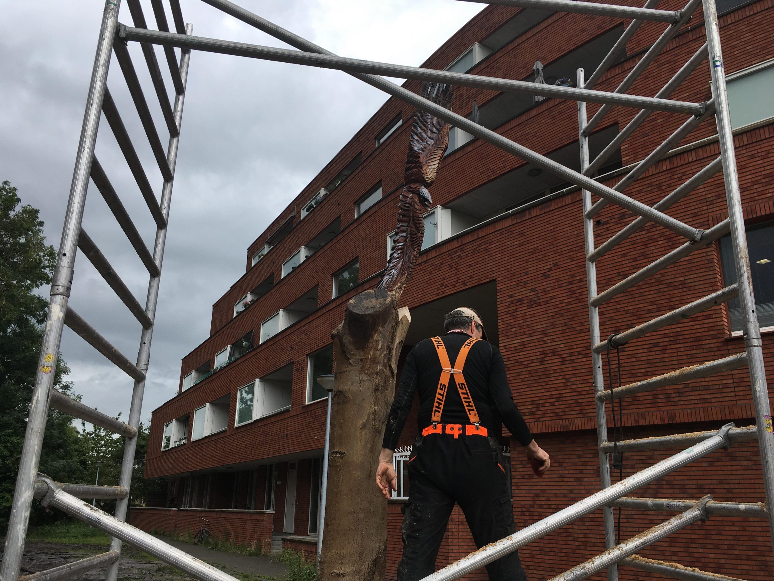 De wijk Lewenborg krijgt er deze dagen twee kunstwerken bij. Een kunstenaar is namelijk bezig om twee bomen met kettingzagen om te toveren tot beelden van een arend en een zeemeermin.