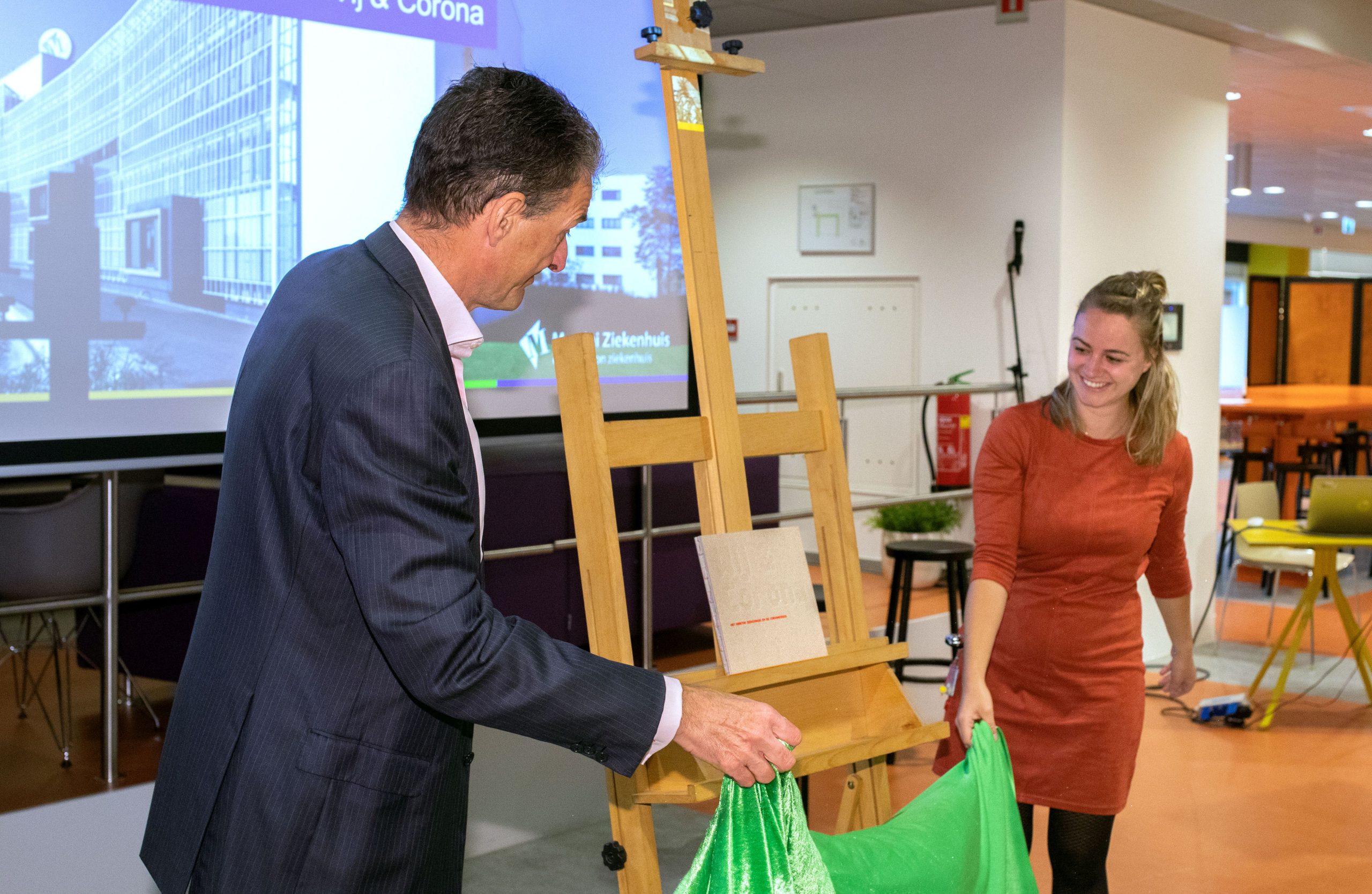 Madelon de Geus- Bouwman, kinderverpleegkundige in het Martini Ziekenhuis, kreeg donderdagochtend het eerste exemplaar van het boek ‘Wij & Corona’ uitgereikt door bestuursvoorzitter Hans Feenstra. Het boek vertelt het verhaal van de coronacrisis in het Martini Ziekenhuis.
