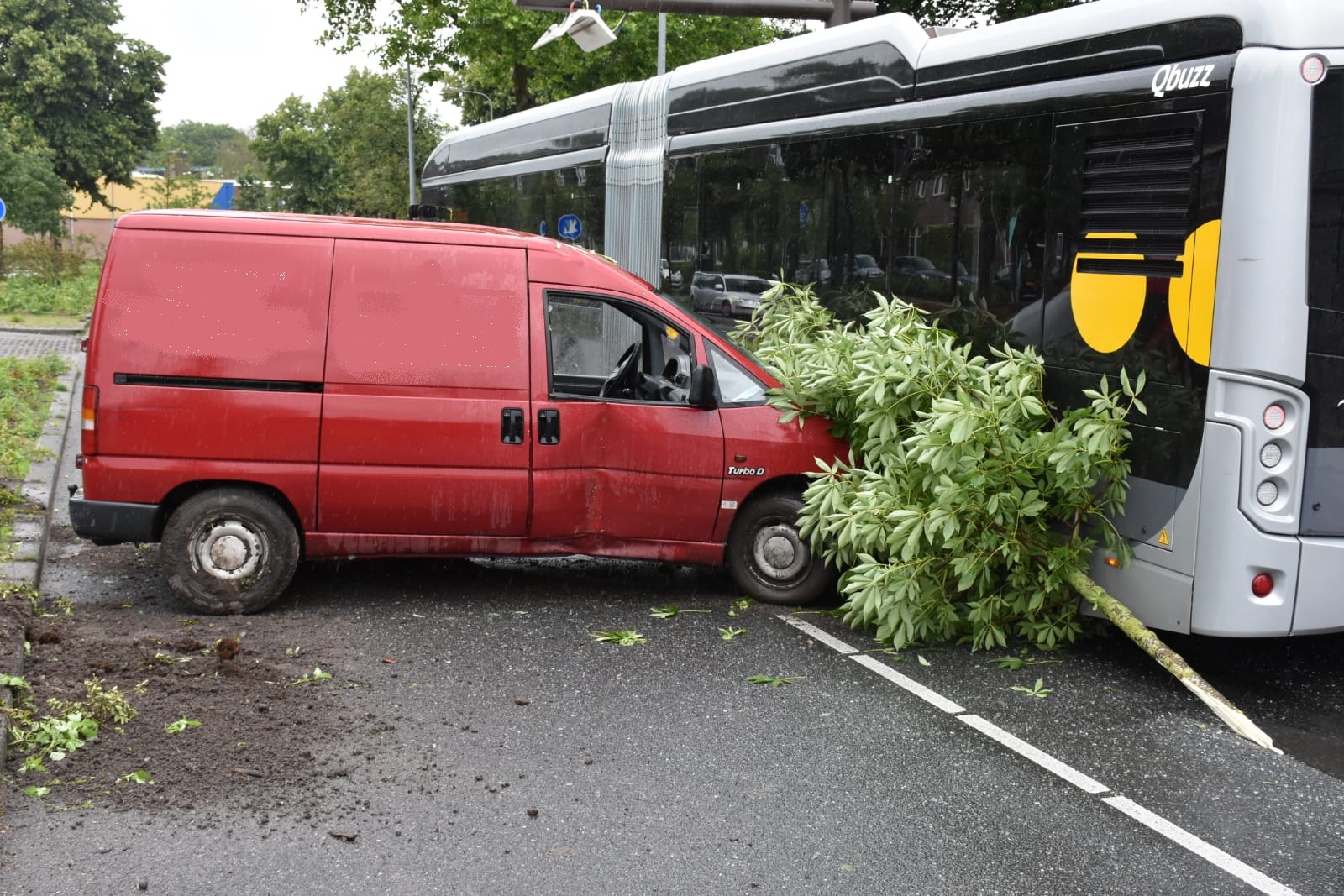 Vanwege het ongeluk is de Kastanjelaan afgesloten. Een bergingsbedrijf gaat het bestelbusje wegslepen.