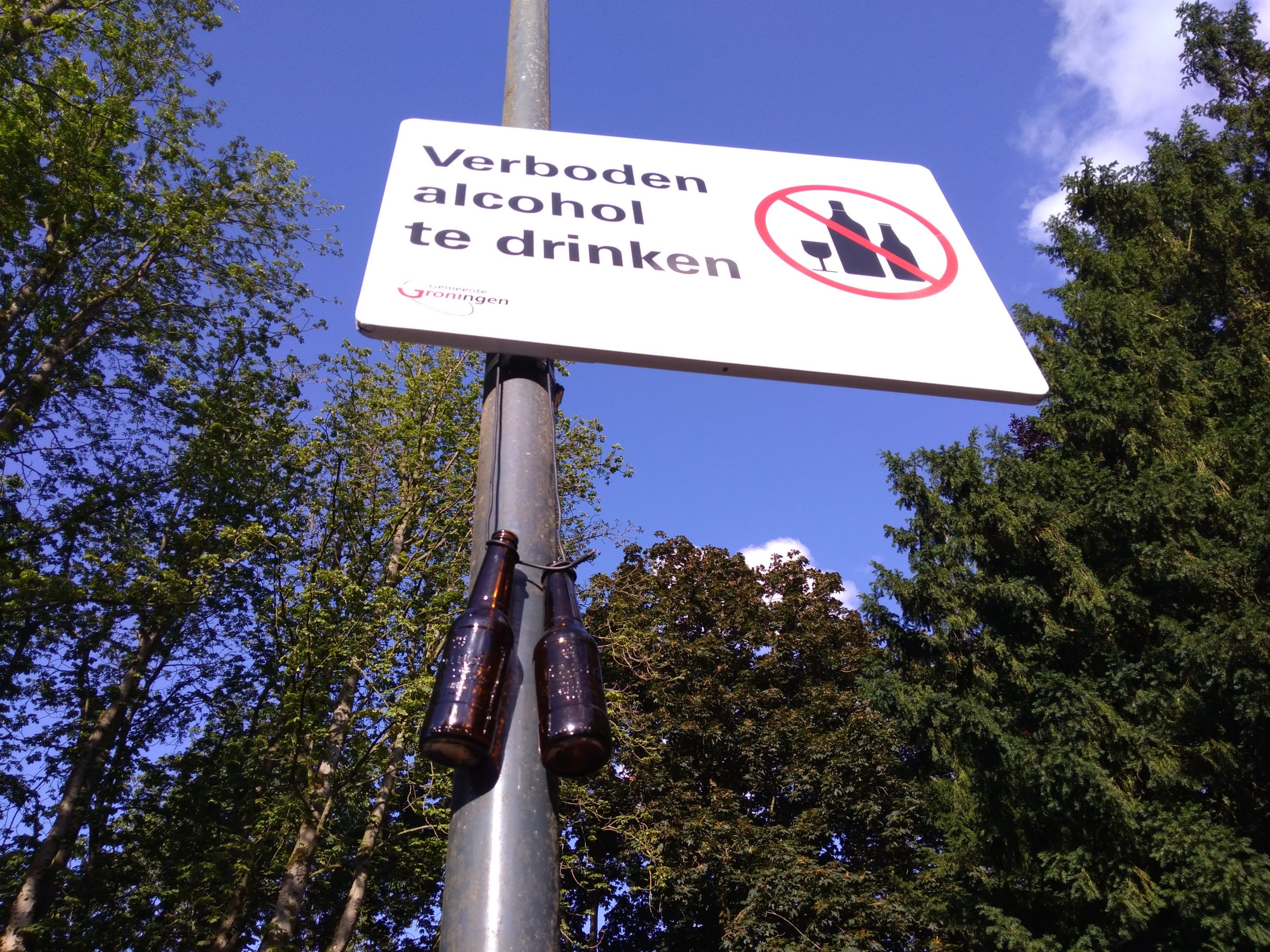 Twee lege bierflesjes, aan elkaar verbonden met een kabel, hangen demonstratief aan het anti-alcoholbord. Omdat het bord circa drie meter hoog hangt niet eens een eenvoudig klusje.