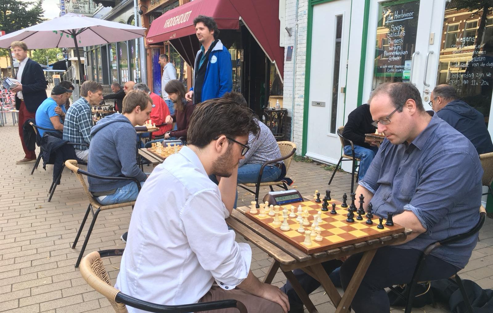 Tijdens de zomermaanden kun je elke woensdagavond aan het Zuiderdiep, vóór en in Proeflokaal Hooghoudt, tientallen schakers aantreffen.