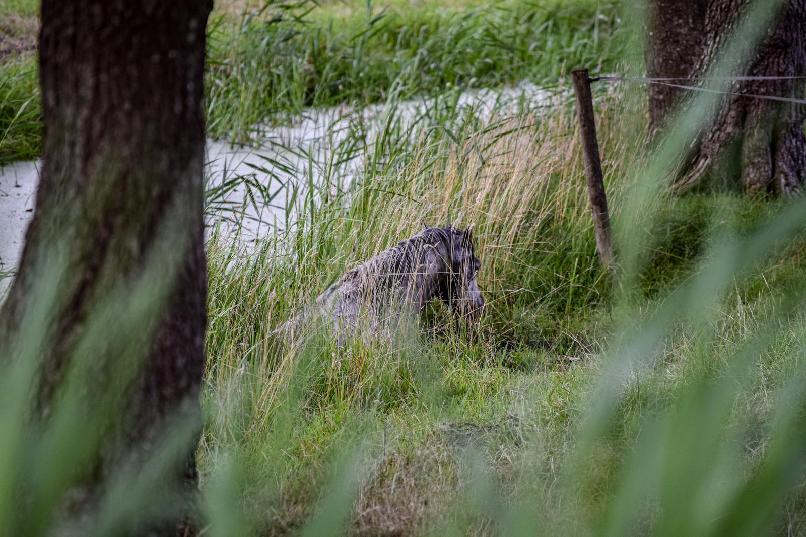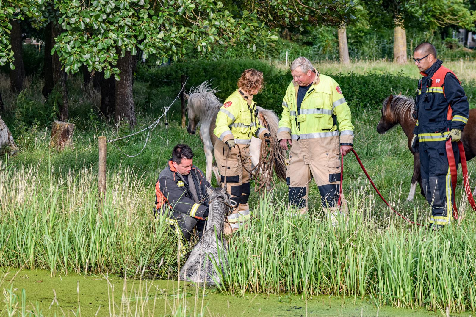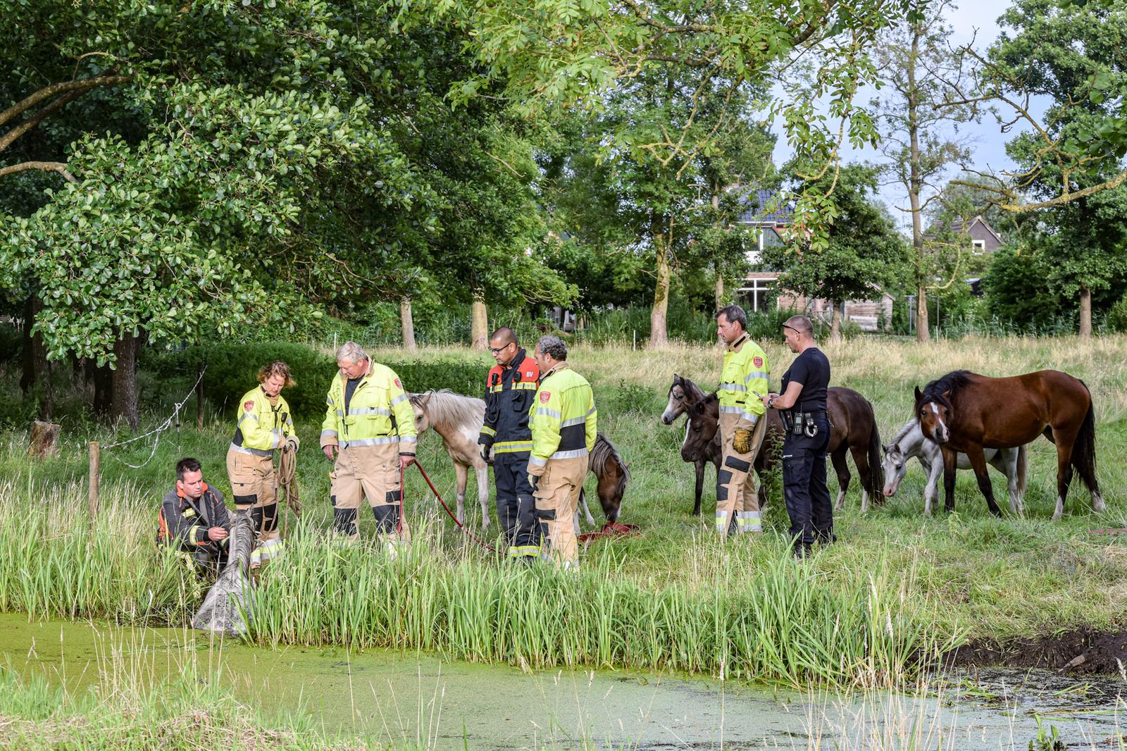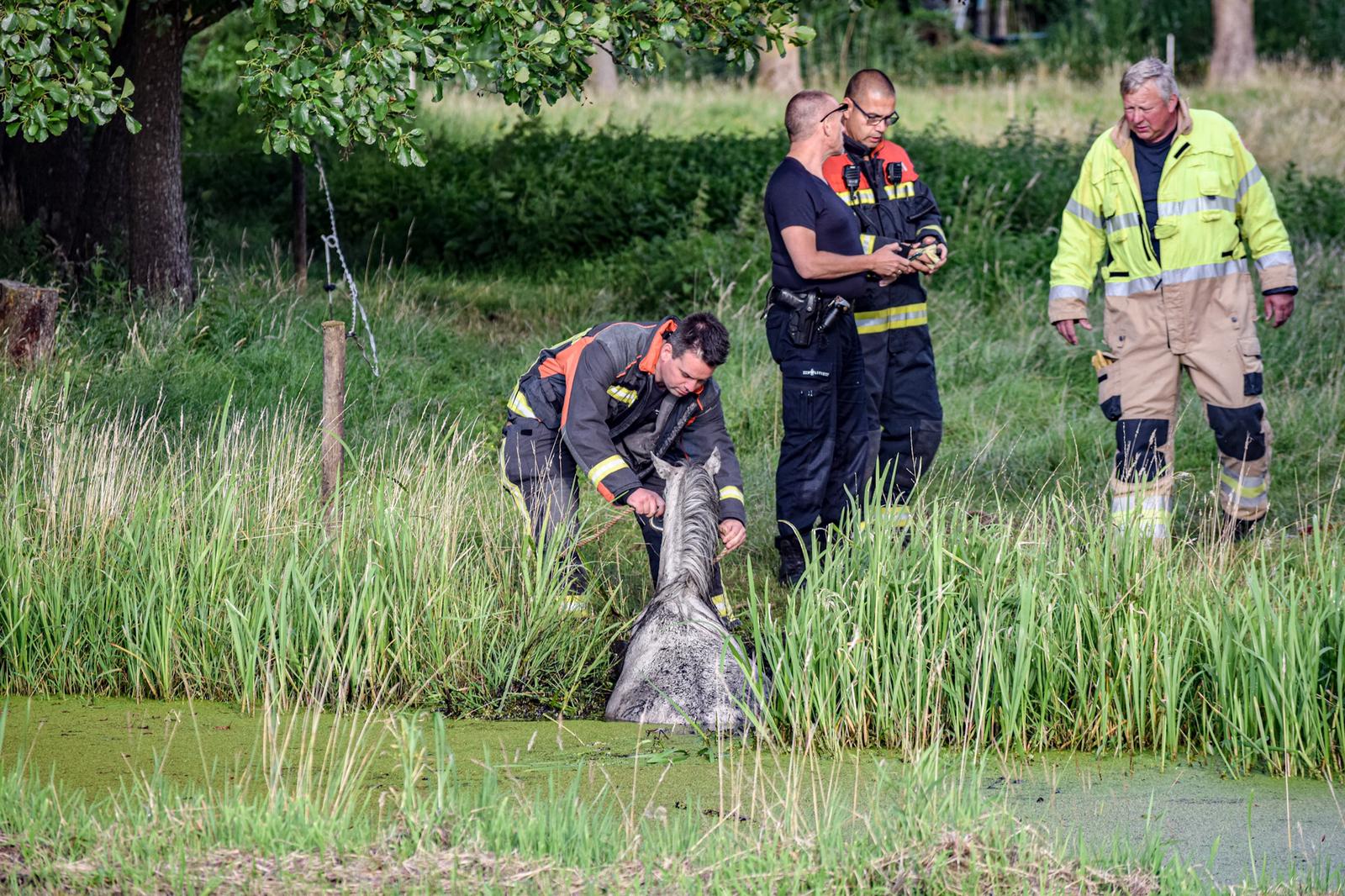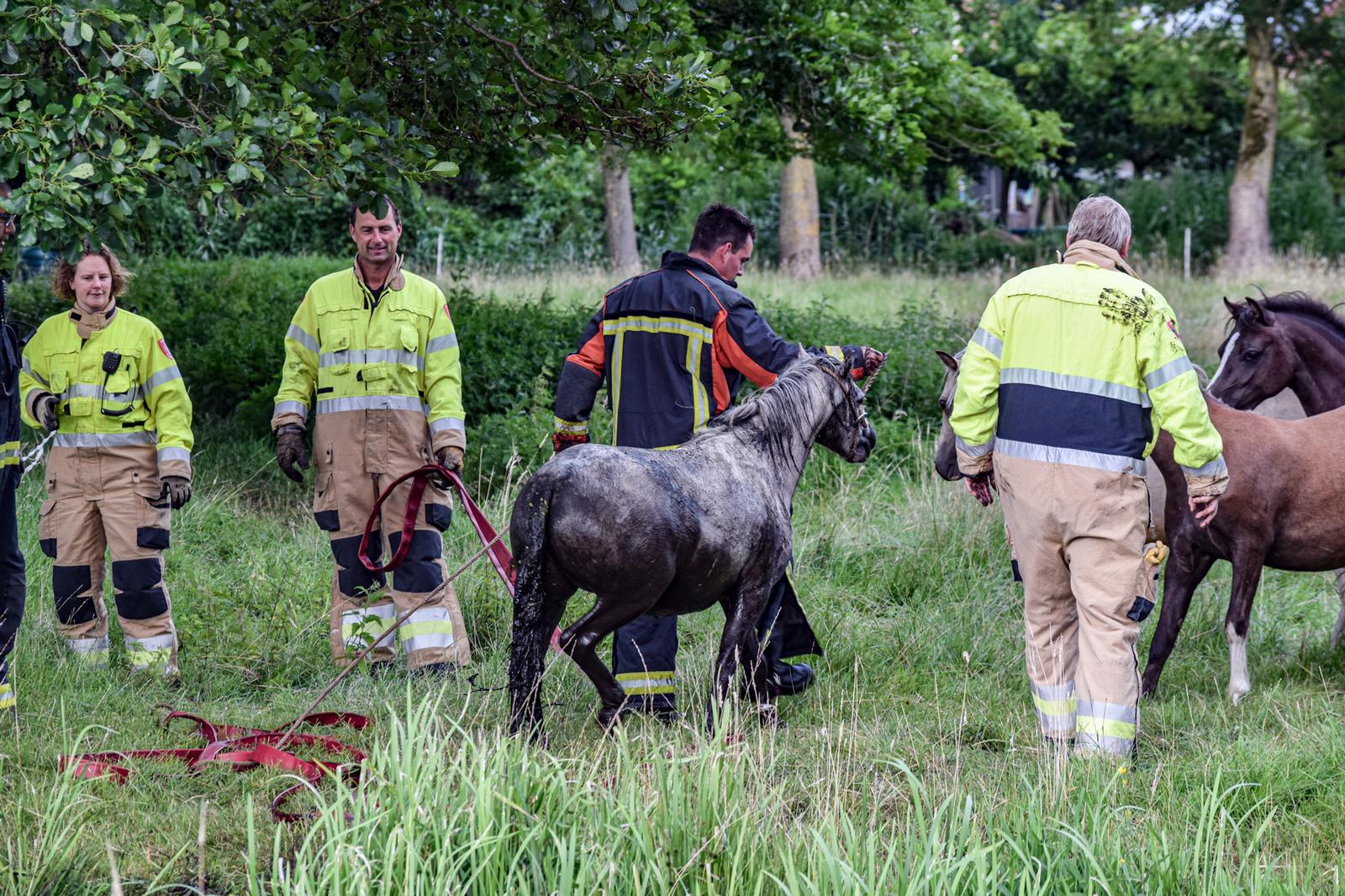Met touwen en brandslangen poogden brandweerlieden het dier op het droge te krijgen. “Dat was nog een hele klus. In het weiland stonden namelijk ook diverse andere paarden en zij vonden die mannen en vrouwen van de brandweer maar wat interessant. Nadat er wat ruimte was gemaakt kon het paard uiteindelijk op het droge worden geholpen.” Ogenschijnlijk raakte het dier niet gewond.