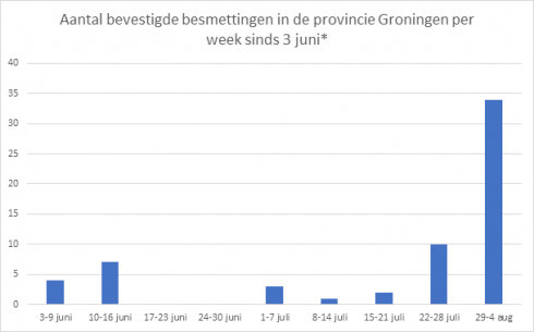 De 34 nieuwe gevallen betekent een forse toename van het aantal besmettingsgevallen. In de periode van 3 juni tot en met 21 juli kwamen er wekelijks een aantal bij. Tussen 17 en 30 juni werden er helemaal geen nieuwe gevallen geregistreerd. Vorige week werden er tien gevallen ontdekt, nu dus 34. “We zien een duidelijke stijging. Door middel van uitgebreid bron- en contactonderzoek en de daaruit volgende quarantaine-adviezen proberen we de verspreiding van het virus via besmette personen zo snel mogelijk te stoppen.”