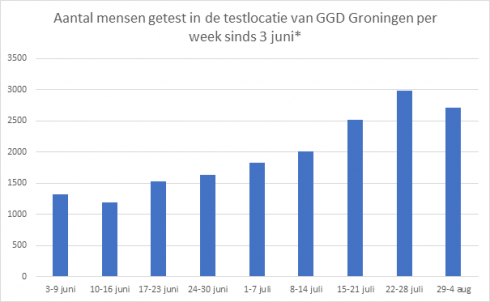 Om het virus te traceren blijft testen onverminderd belangrijk. De afgelopen week lieten 2.717 mensen zich testen. Dit zijn er ruim tweehonderd minder dan in de week daarvoor. Van deze 2.717 bleken er 21 positief te zijn, 0,7%. In de periode van 1 juni tot 4 augustus zijn er nu 17.939 mensen getest in Groningen.