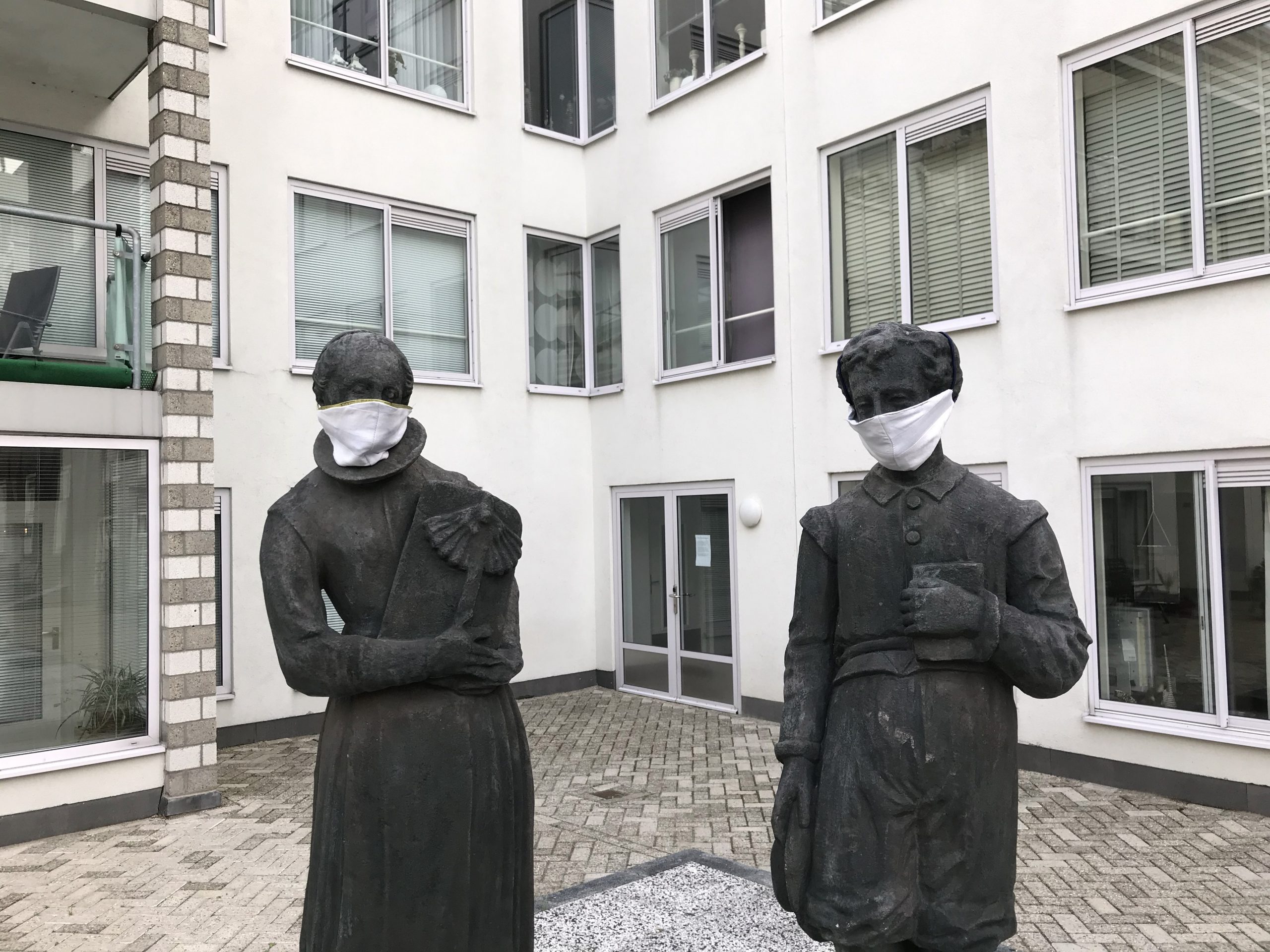 De twee beelden stellen twee weesjes voor. Het zijn afgietsels van de beelden bovenop de entreepoort van het complex die tot de oudste sculpturen van de stad behoren. “Het is een geintje”, vertelt een bewoner. “Maar wel een geintje met een serieuze ondertoon. We zijn nog lang niet van het coronavirus af. Ik merk bijvoorbeeld helemaal niets meer van het houden van anderhalve meter afstand.”