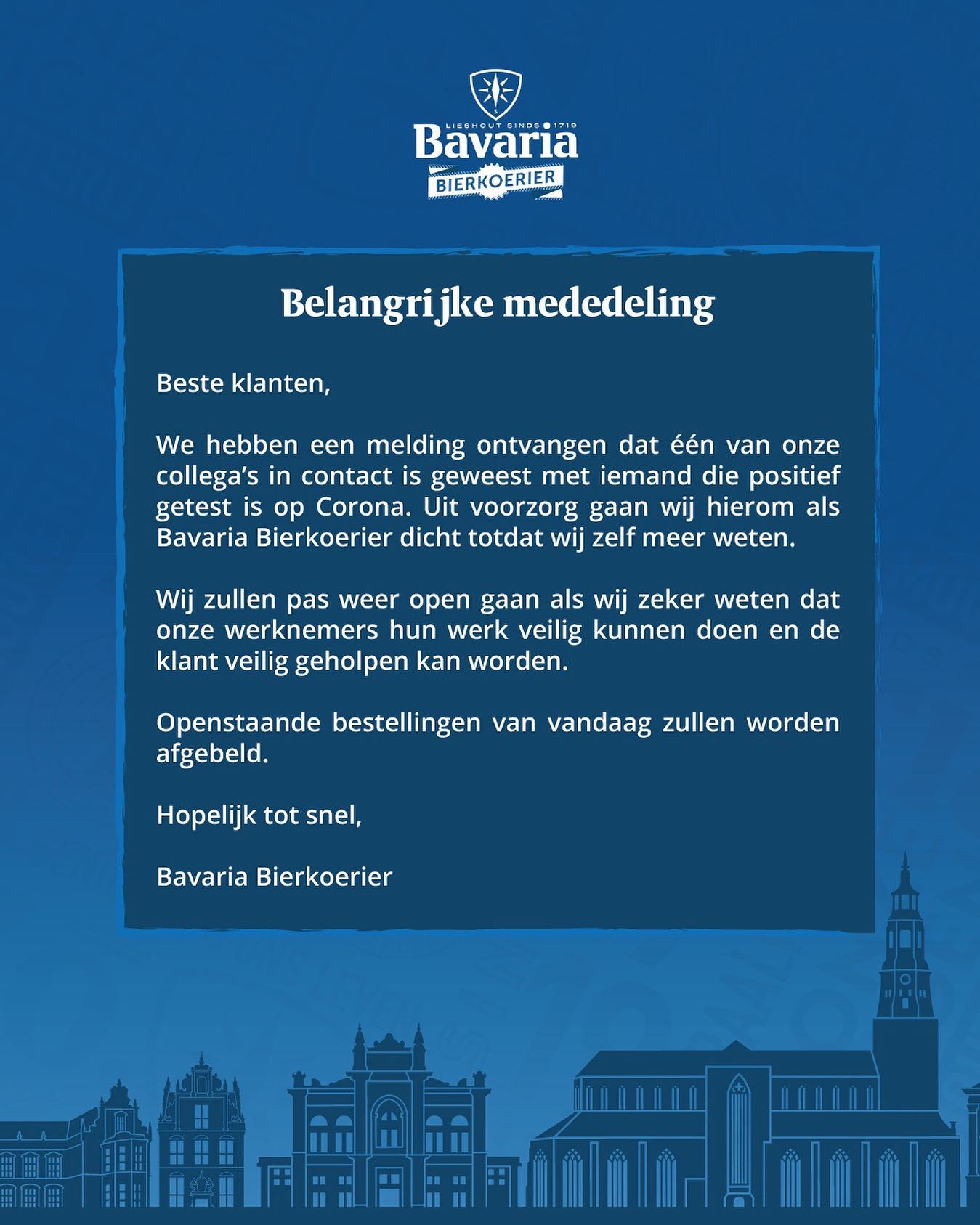 De Bierkoerier van Bavaria in Groningen heeft werkzaamheden tijdelijk stil moeten leggen door een coronabesmetting in de directe omgeving van een personeelslid. Alle bestelling zullen worden afgebeld. De eigenaren hopen zaterdag weer open te gaan.