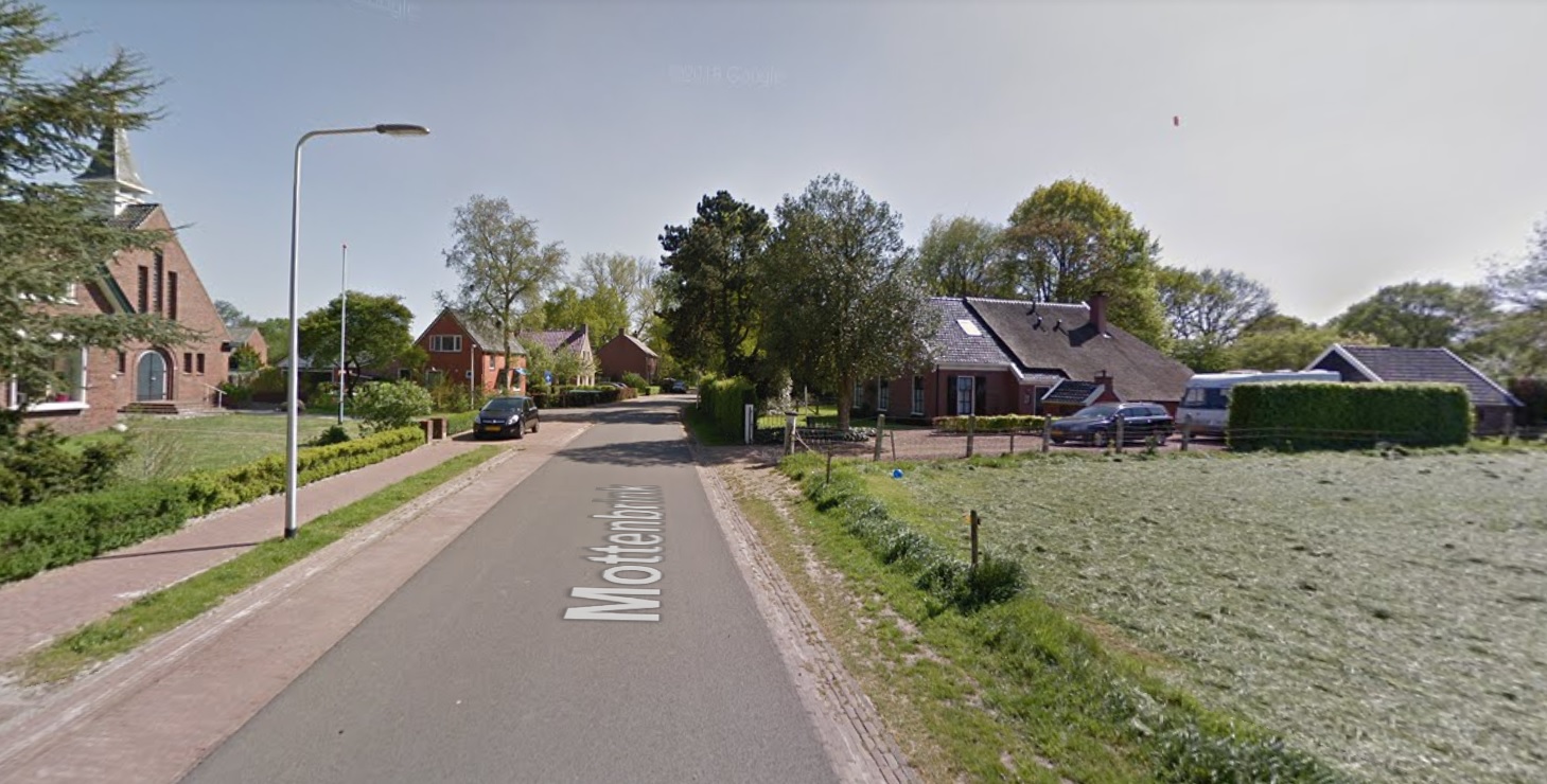 De Mottenbrink met links het kerkgebouw en rechts een deel van het weiland. Foto: Google Streetview