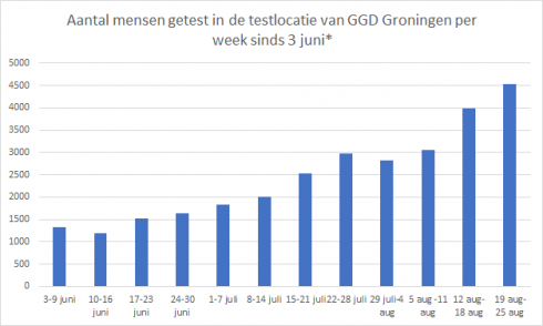 Een recordaantal mensen liet zich afgelopen week testen op de GGD-testlocatie bij het UMCG en op de nieuwe locatie in Veendam. In totaal werden er 4.525 mensen getest. In de week daarvoor stond dit aantal op 3.983. Van deze 4.525 testen waren 27 positief, dat is 0,6 procent. Sinds 1 juni kan iedereen getest worden. Het totaal aantal afgenomen testen in onze provincie staat nu op 29.501.