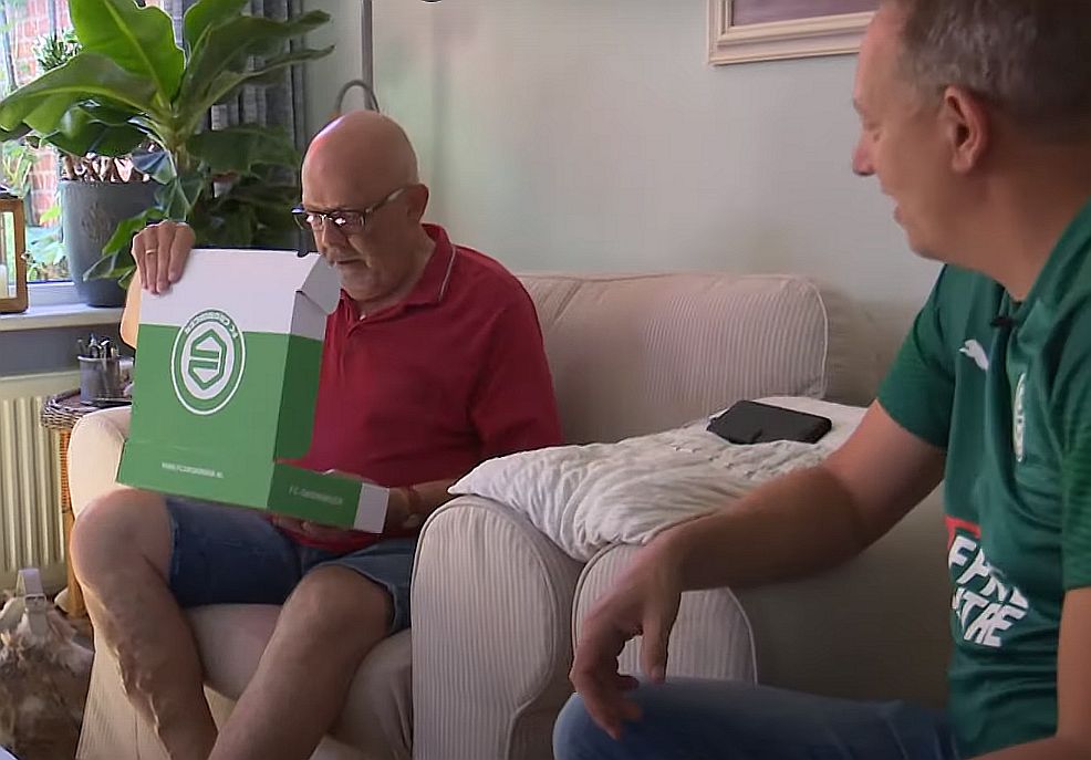 Clubliefde deed Jan Wilderman, de man wiens stem al zo’n veertig jaar door de speakers van FC Groningen schalt, besluiten om zijn vrijwilligersvergoeding te doneren aan de Stichting ‘Laat ons weer eens samen juichen’. Dat mooie gebaar was voor supporterscoördinator Matthias Mulder aanleiding om thuis bij Wilderman langs te komen met twee bijzondere cadeau’s.
