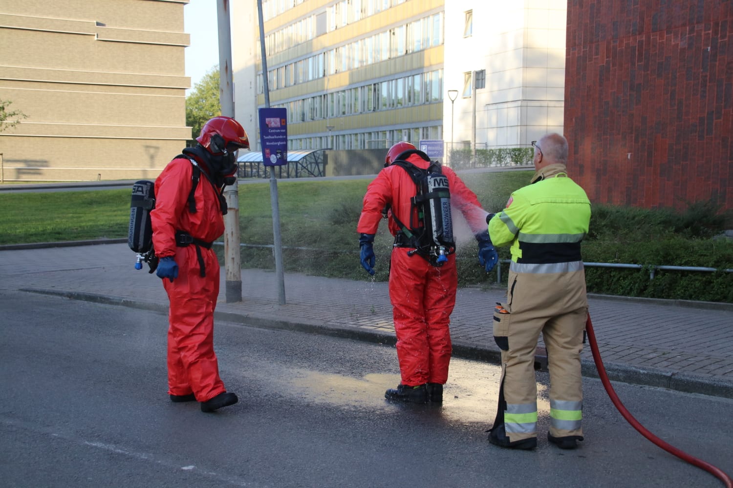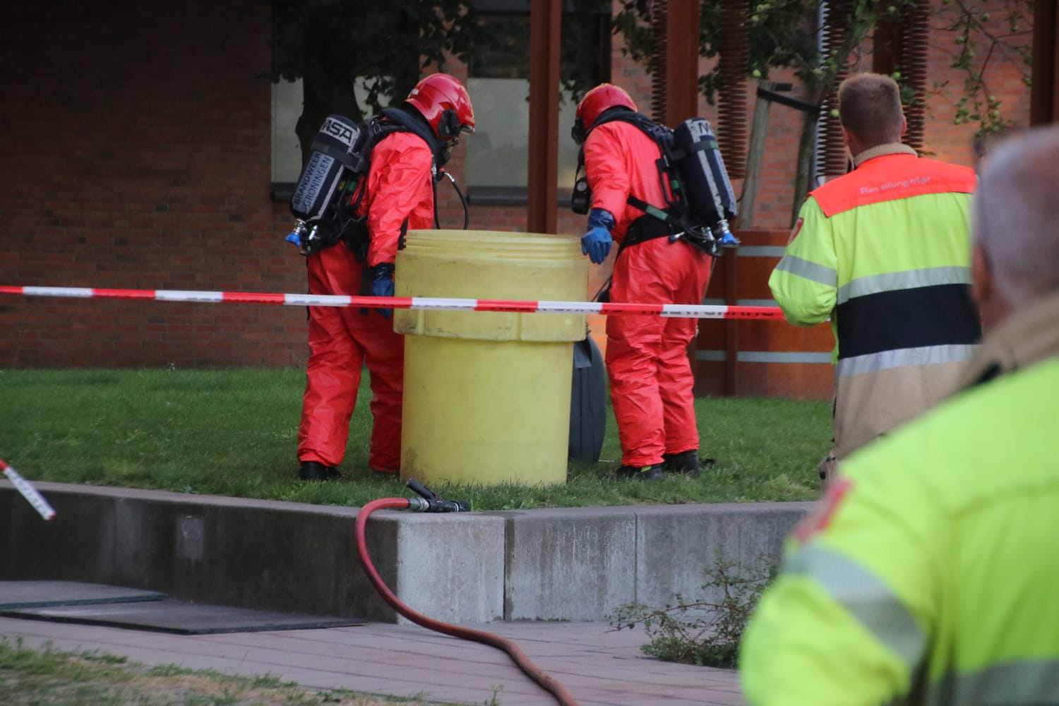 Volgens de woordvoerder is de situatie rond 20.15 uur onder controle. “We hebben de stof naar buiten gebracht in een ton. Deze ton zal afgevoerd worden door een gespecialiseerd bedrijf.” Volgens incidentfotograaf Joey Lameris van de incidentenwebsite 112groningen.nl gaan de hulpverleners erg voorzichtig te werk. “Ze dragen speciale pakken en hebben ademluchtmaskers op. Ook is er uit voorzorg een slang uitgerold waarmee snel een blussing gestart kan worden mocht dat nodig zijn. De ton die naar buiten gebracht is, is in een andere ton geplaatst.”