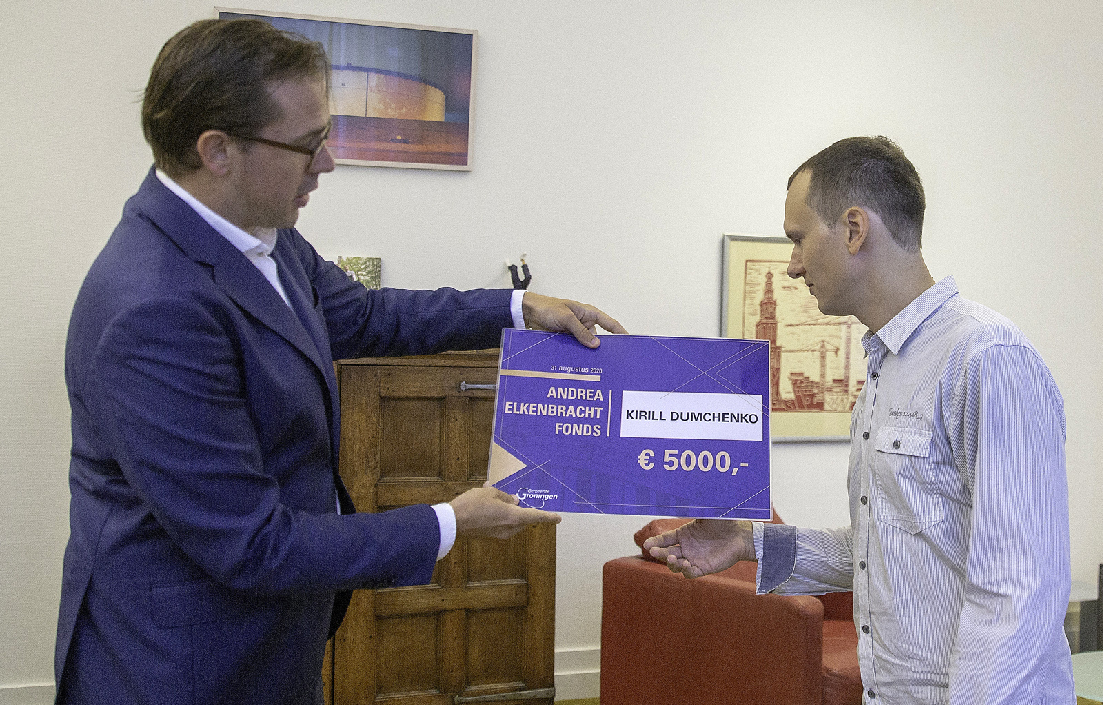 De Russische gitarist, componist en arrangeur Kirill Dumchenko heeft een beurs van 5000 euro uit het Andrea Elkenbrachtfonds van de gemeente Groningen ontvangen. Wethouder Paul de Rook reikte de prijs maandagochtend uit tijdens de opening van het nieuwe academische jaar van het Prins Claus Conservatorium.
