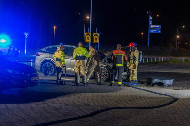 De melding van de brand kwam rond middernacht bij de brandweer binnen die daarop uitrukte met een tankautospuit. Bij aankomst bleek de brand te woeden in een Tesla, een elektrische personenauto. Deze wagen stond geparkeerd op het buitenterrein van een garagebedrijf. Brandweerlieden hebben het vuur kunnen blussen met één straal hogedruk. Ondanks dat raakte het voertuig flink beschadigd.