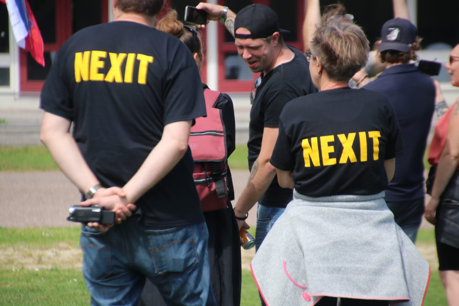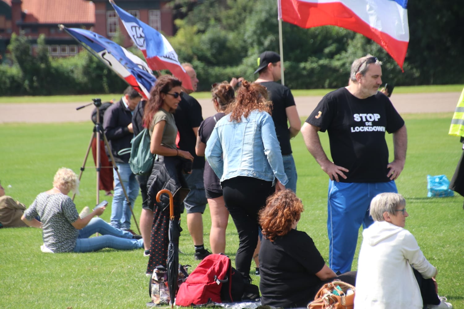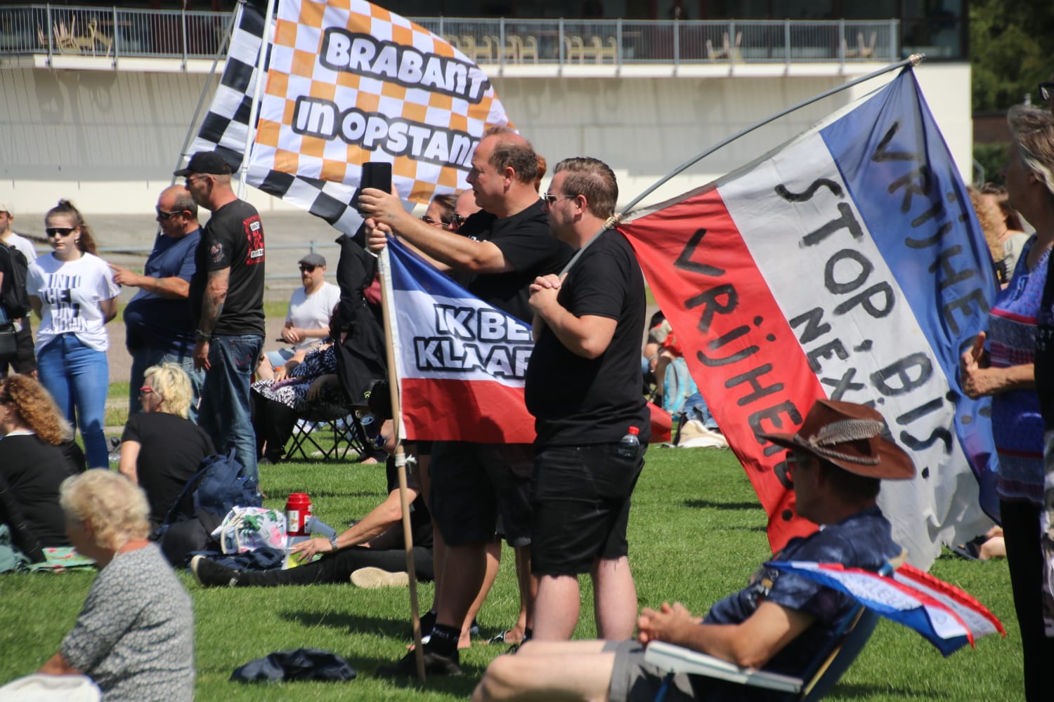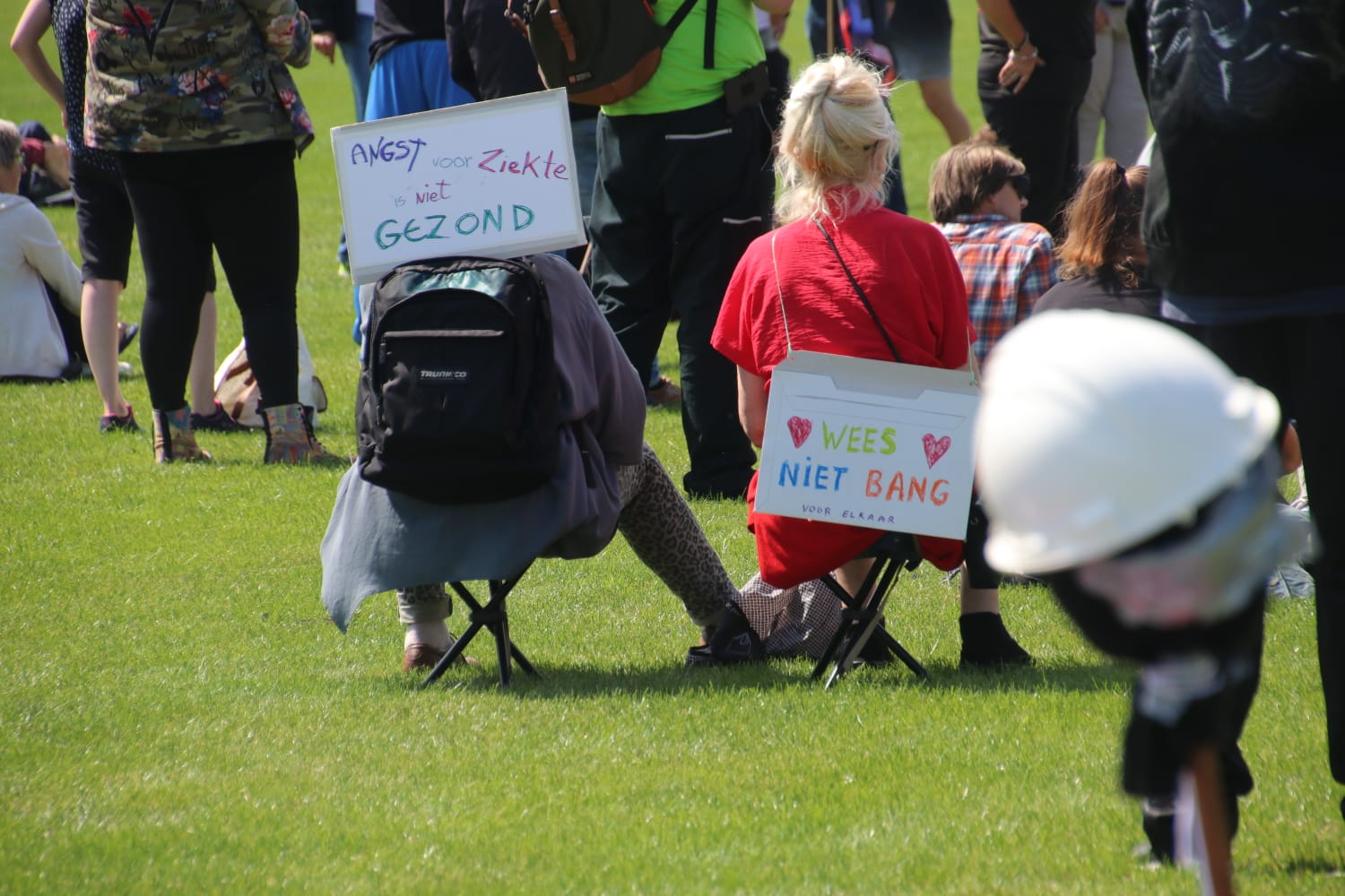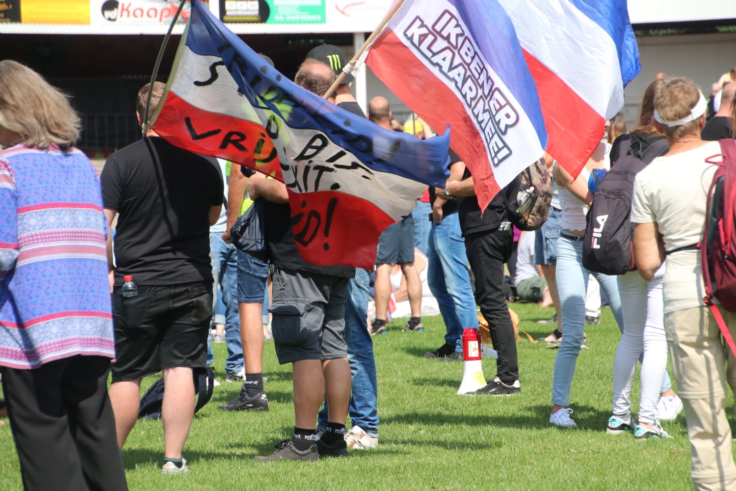 “De sfeer is rustig en gemoedelijk”, vertelt Lameris. “Er zijn mensen die toespraken houden, er is muziek, en op het veld hebben zich ongeveer 250 mensen verzameld.” Het getal is een schatting. “De organisatie liet zojuist weten dat er vierhonderd tot 450 mensen op het veld zijn.” Volgens Lameris wordt er tegen verschillende onderwerpen gedemonstreerd. “Ik zie hier mensen rondlopen die Nexit-shirts dragen, ik zie de Nederlandse driekleur ondersteboven wapperen en er zijn teksten te lezen als ‘stop de lockdown‘.”