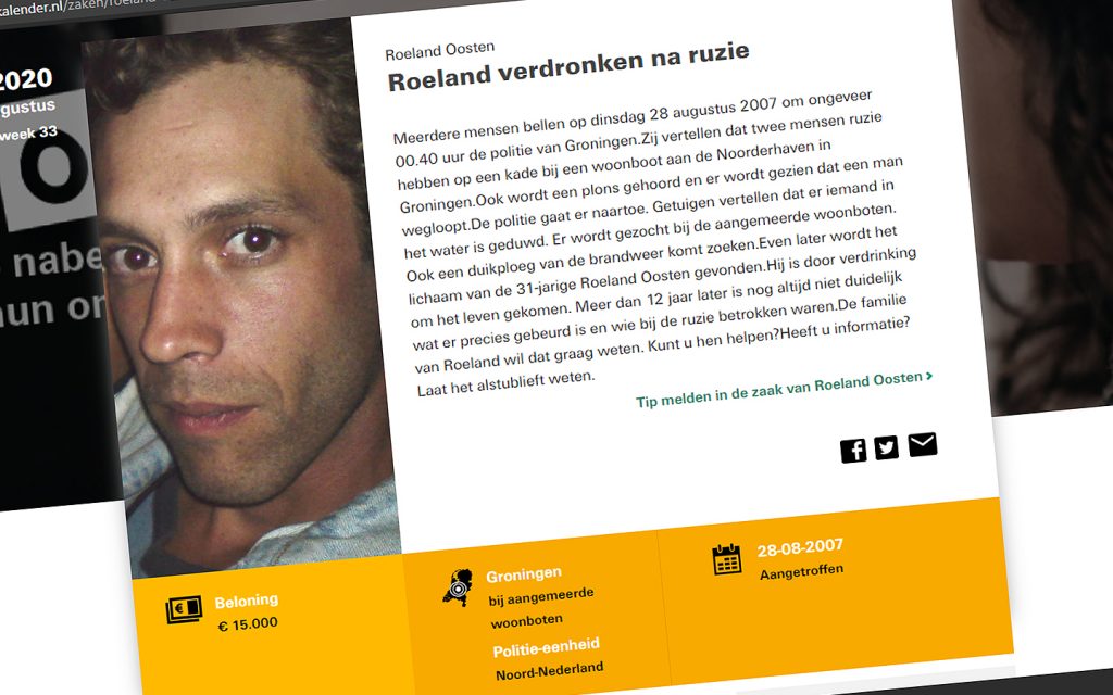 De pagina voor week 33 in de coldcasekalender staat in het teken van de nooit opgeloste dood van Roland Oosten. De politie hoopt dat de pagina in de kalender, die wordt verspreid in gevangenissen, tbs-instellingen en reclasseringskantoren, gaat zorgen voor nieuwe tips in deze zaak.