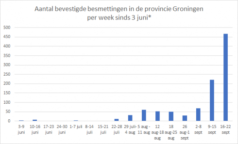 De GGD constateert dat het in de afgelopen week om een forse stijging van het aantal nieuwe besmettingen gaat in vergelijking met de voorbije weken. Ongeveer 70 procent van de personen bij wie een nieuwe besmetting werd vastgesteld in de afgelopen 7 dagen is woonachtig in de stad Groningen. In deze groep van nieuwe besmettingen gaat het niet om grote clusters maar wel veel kleine clusters.