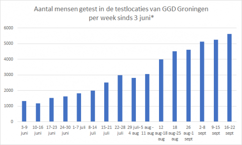 Het aantal personen dat in de afgelopen week getest werd ligt opnieuw hoger dan in de afgelopen weken. In totaal werden er op de testlocaties in de stad Groningen en Veendam 5.630 mensen getest. Vorige week lag dit op 5.257 en in de week daarvoor op 5.129. In de periode van 1 juni tot 22 september hebben zich nu 50.117 personen zich laten testen. Van de 5.630 testen bleken er afgelopen week 333 positief te zijn. Dit komt neer op 5,7 procent.
