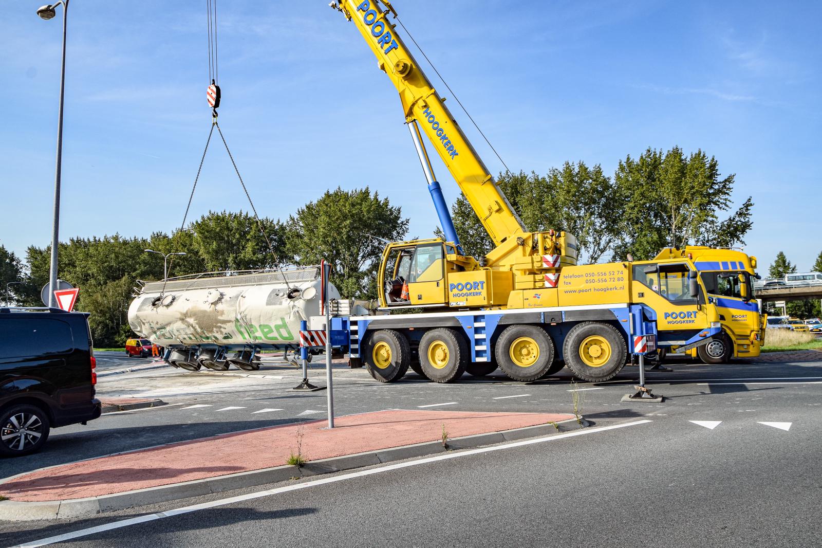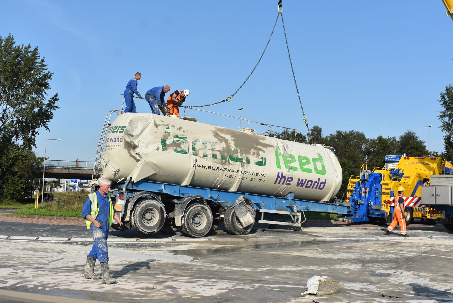 De bulkwagen die in het begin van de middag kantelde op de rotonde Ruskenveen bij Hoogkerk is geborgen. Dat meldt Mike Weening van Weening Fotografie.