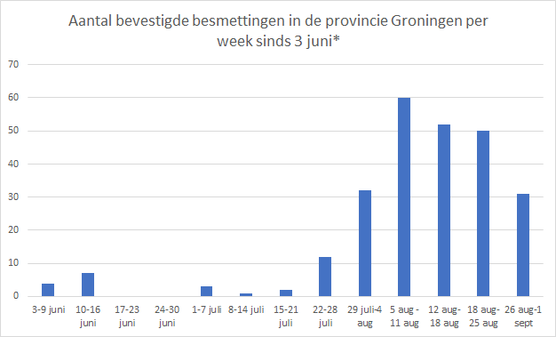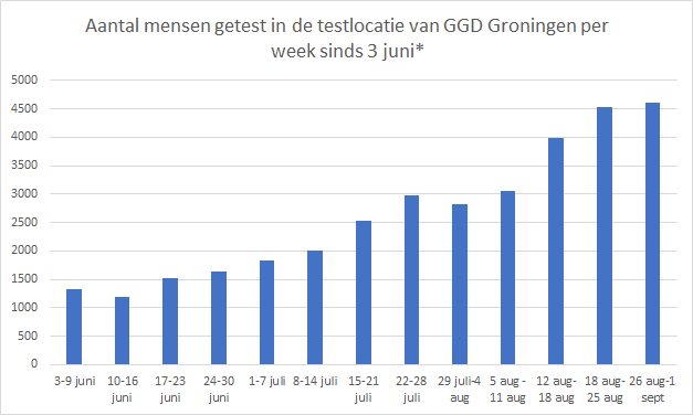 Het aantal personen dat zich de afgelopen zeven dagen heeft laten testen op het coronavirus is opnieuw toegenomen. In de periode van 12 tot en met 18 augustus ging het om 3.983 mensen die zich lieten testen. In de periode van 19 tot 25 augustus nam dit toe tot 4.525. Van 26 augustus tot 1 september ging het om 4.600 mensen die zich lieten testen in Groningen of Veendam. Van hen bleek 0,4 procent positief te zijn. Sinds 1 juni kan iedereen met klachten zich laten testen. Tot nu toe hebben 34.101 mensen daar gebruik van gemaakt.