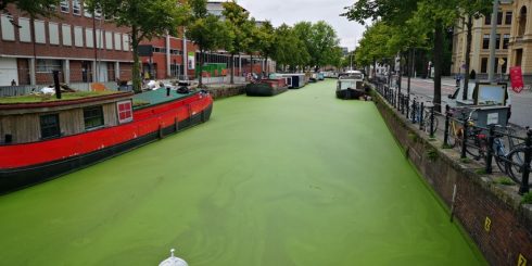 “Mooie foto hè?” Schrijft Jan Willem in een mailtje dat hij dinsdagavond naar OOG stuurt. “Een groene oase voor het Groninger Museum.” Ook Michel trok er op uit. Hij ging naar de Turfsingel om daar foto’s te maken van het groene water. Dat het water groen is komt eens in de paar jaar voor. De groene laag is kroos. Het zijn kleine waterplantjes. De plantjes zijn klein en zouden los van elkaar bijna niet te zien zijn. Maar doordat ze zich samenklonteren ontstaat er een groen tapijt.