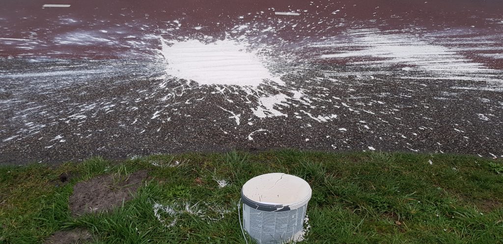 Mensen kopen verf, hangen de emmer aan de fiets, die bij het eerste kuiltje valt, waarna de medeweggebruikers de vrijgekomen verf verder de weg op rijden.