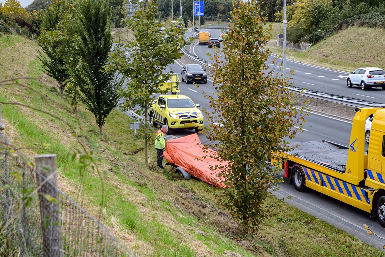 Een bergingswagen heeft de aanhanger losgetrokken uit de berm en vervolgens afgevoerd. Er wordt onderzoek gedaan waar de aanhanger vandaan komt.