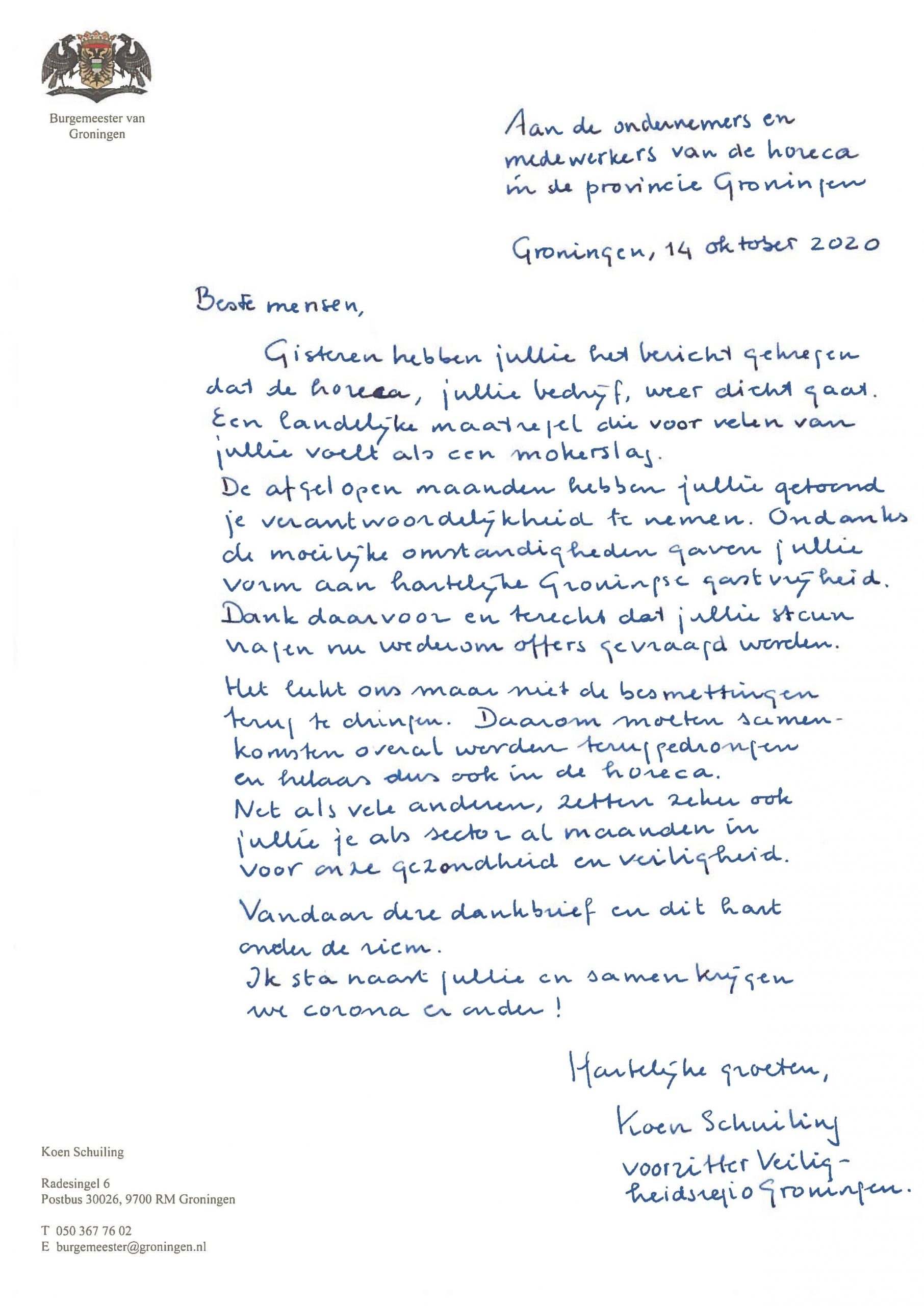 Nadat dinsdagavond duidelijk werd dat de horeca opnieuw de deuren moet sluiten voor gasten om het coronavirus terug te dringen, besloot burgemeester Koen Schuiling van Groningen afgelopen woensdag om de ondernemers in deze branche een hart onder de riem te steken met een handgeschreven brief: “Ik sta naast jullie en samen krijgen we corona eronder!”