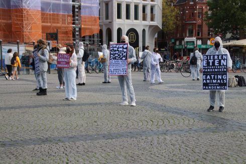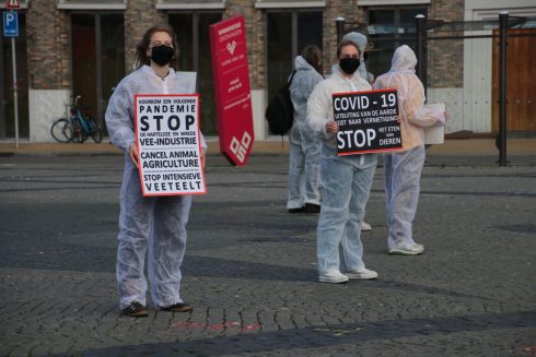 De demonstranten waren gekleed in witte pakken en droegen mondkapjes. Ze hadden borden bij zich waar verschillende teksten op stonden. “Vóór de dieren, de aarde, de mens, eet 100% plantaardig”, stond op één van de borden te lezen. Op een ander bord stond: “Dieren eten veroorzaakt pandemieën.” De actie verliep geruisloos.