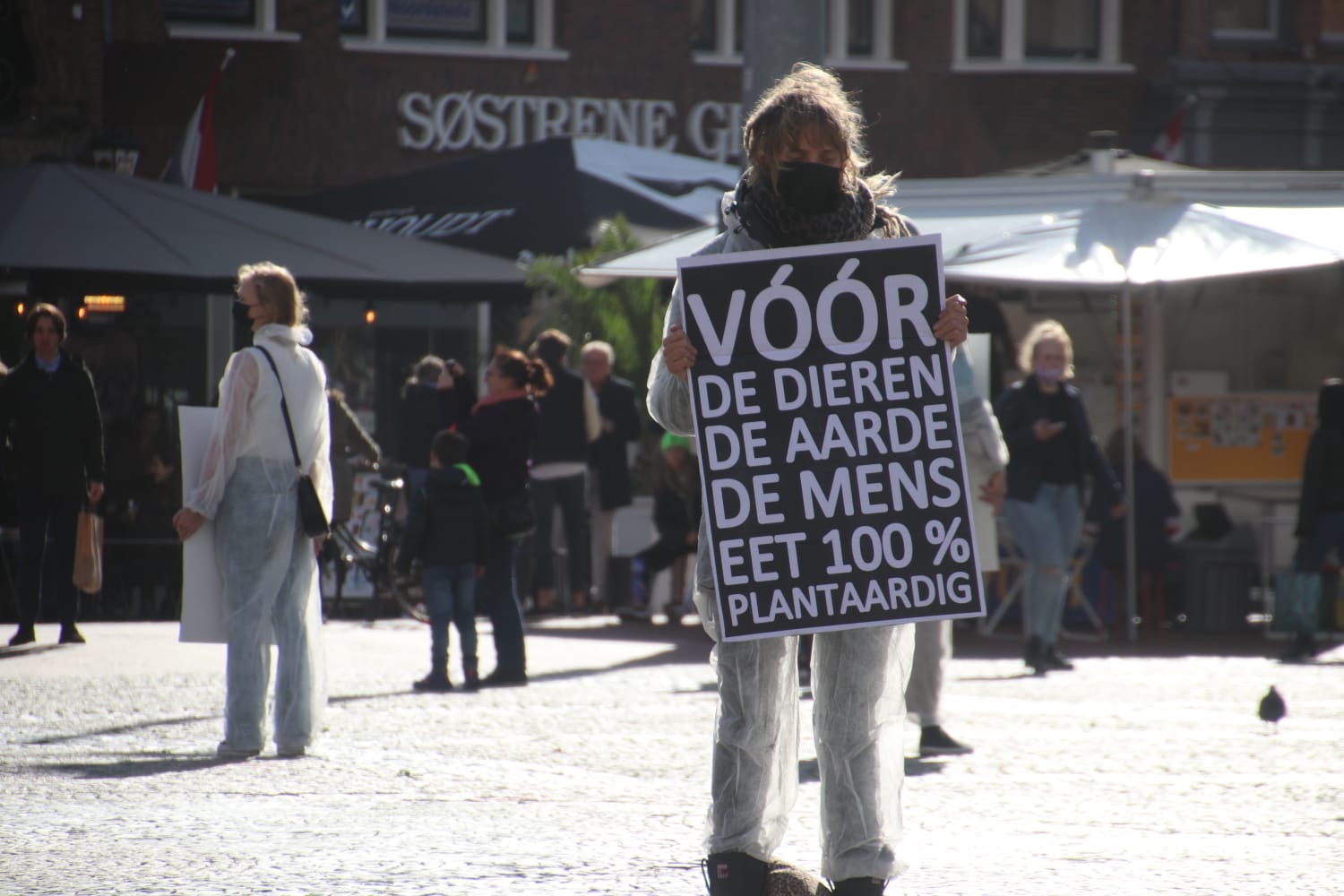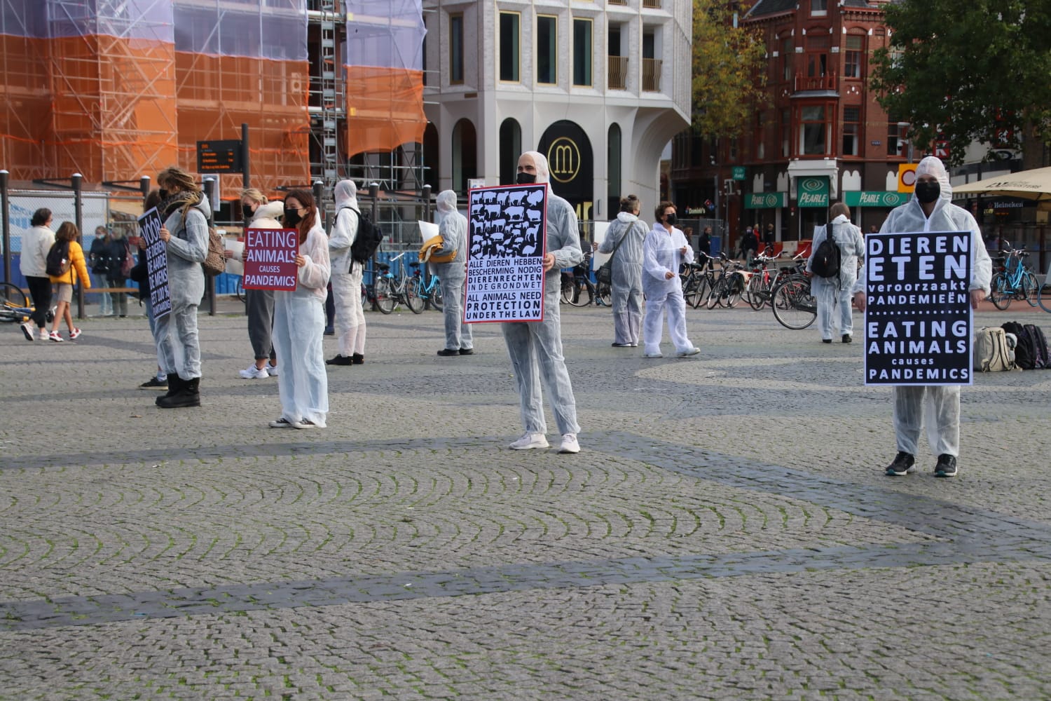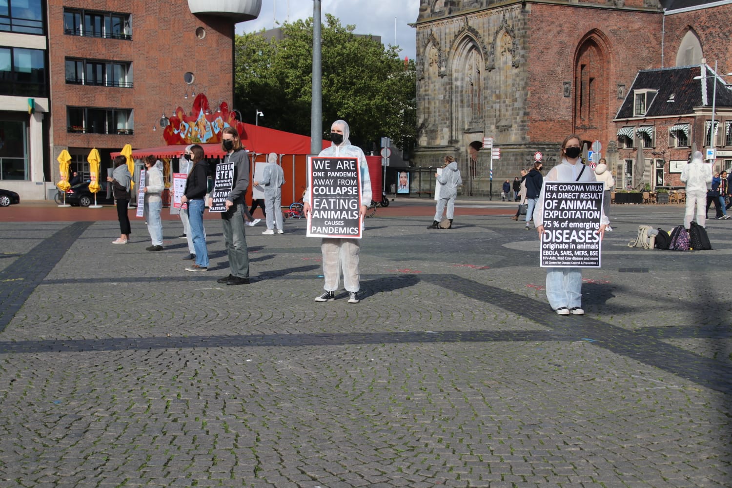 De demonstranten waren gekleed in witte pakken en droegen mondkapjes. Ze hadden borden bij zich waar verschillende teksten op stonden. “Vóór de dieren, de aarde, de mens, eet 100% plantaardig”, stond op één van de borden te lezen. Op een ander bord stond: “Dieren eten veroorzaakt pandemieën.” De actie verliep geruisloos.