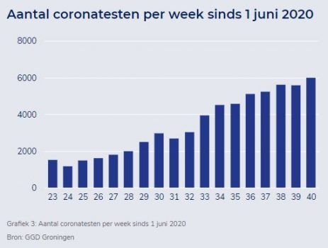 In de provincie Groningen blijft het aantal besmettingen fors oplopen. Voor de GGD is het lang niet meer altijd duidelijk waar het virus wordt opgelopen. “Bij het aandeel waarvan een vermoedelijke bron bekend is, ongeveer een kwart van de gevallen, lag deze in ruim 60% van de gevallen in de thuissituatie. Bij 16% gaat het om vrijetijdsbestedingen als sport, studentenactiviteiten en vriendenbezoeken.”