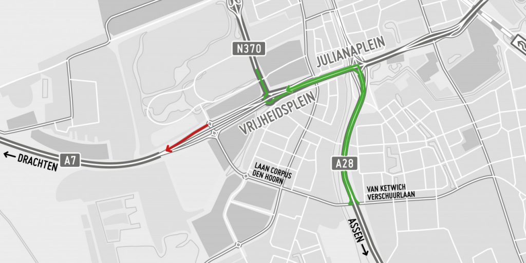Verkeer dat vanaf de westelijke ringweg richting Drachten wil, wordt vrijdag vanaf 20.00 uur omgeleid via het Julianaplein en de af- en oprit Groningen-Zuid op de A28. Het verkeer rijdt dan terug naar het Julianaplein en vervolgens linksaf richting Drachten. Ook het verkeer vanaf de Laan Corpus den Hoorn wordt omgeleid via de A28 en het Julianaplein.