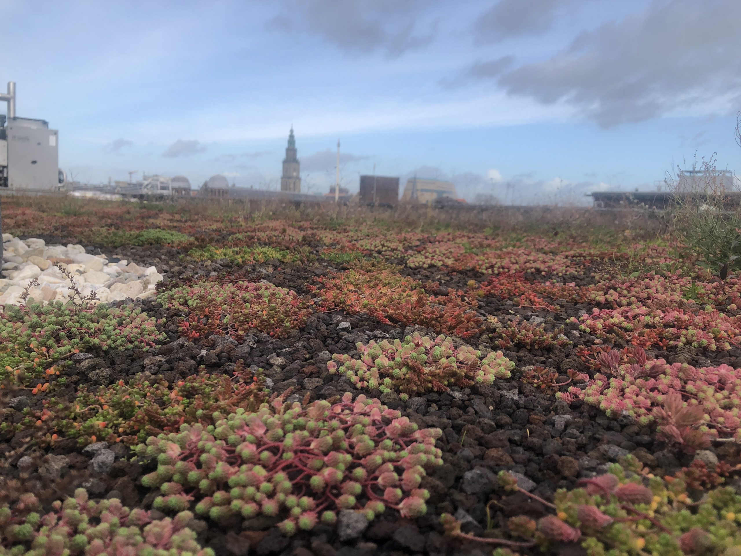 De laatste jaren krijgen we steeds vaker te maken met periodes van extreme hitte of regenval. Met name in de binnenstad van Groningen lopen de temperaturen door de vele platte daken in de zomer flink op. De grote hoeveelheid bestraatgebied zorgt ervoor dat het riool stevige regenbuien niet altijd goed kan verwerken. Dit groene dak zorgt ervoor dat de regen langer wordt vastgehouden en in de zomer zorgt het voor verkoeling voor de werknemers.