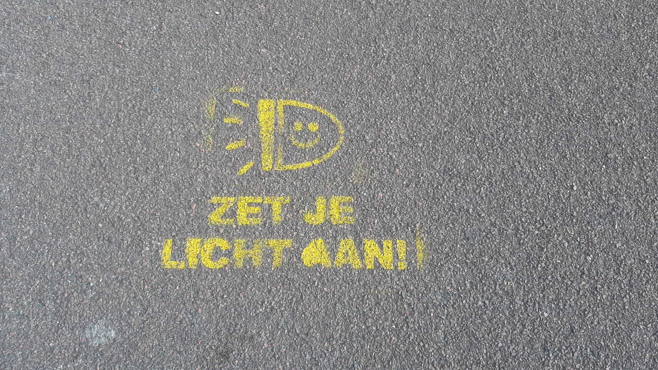 Op diverse fietspaden en straten in de stad wordt er op gewezen om je licht aan te zetten. Met gele verf is de waarschuwing op straat aangebracht.