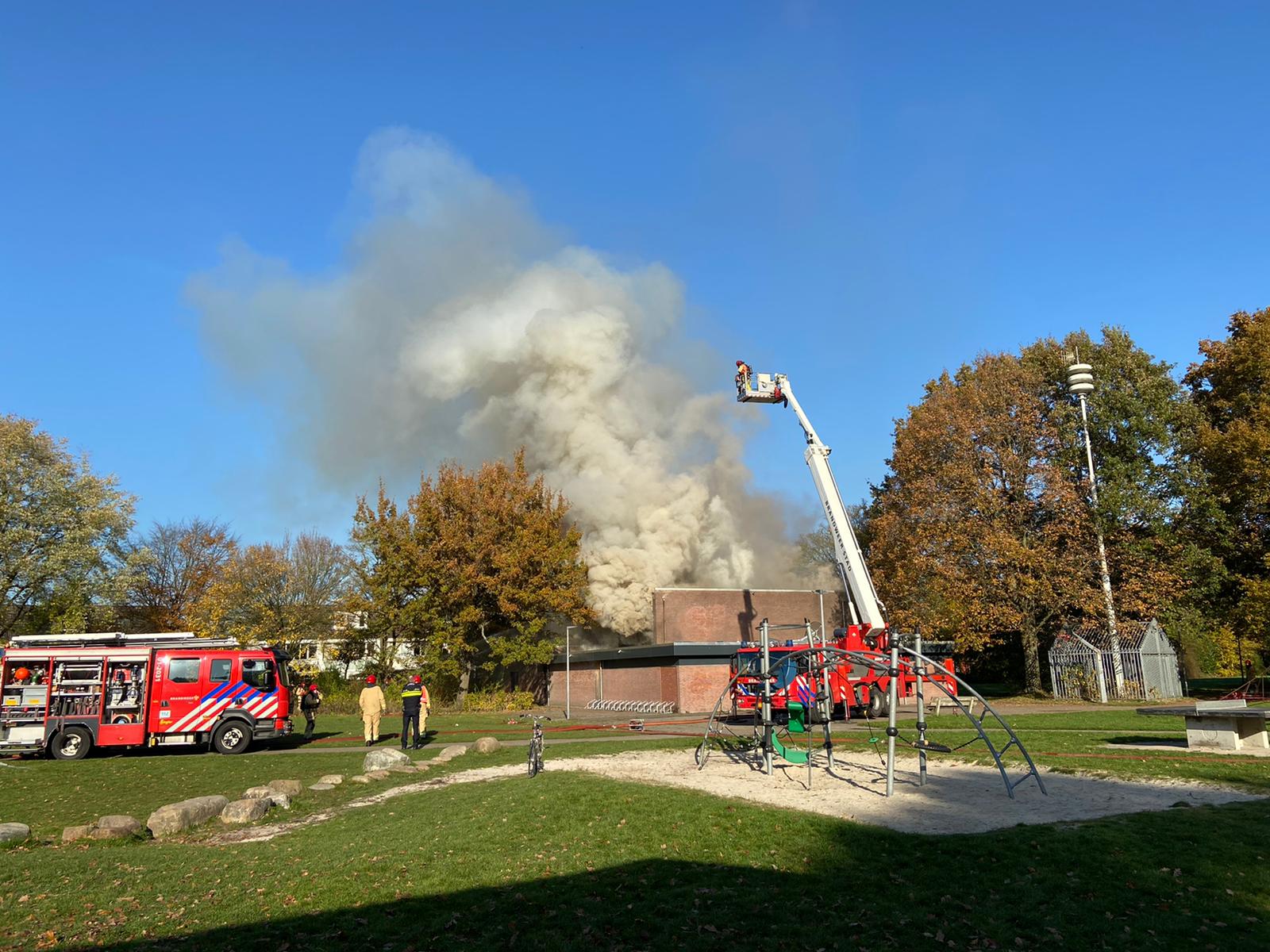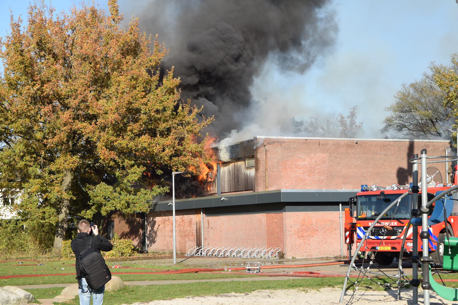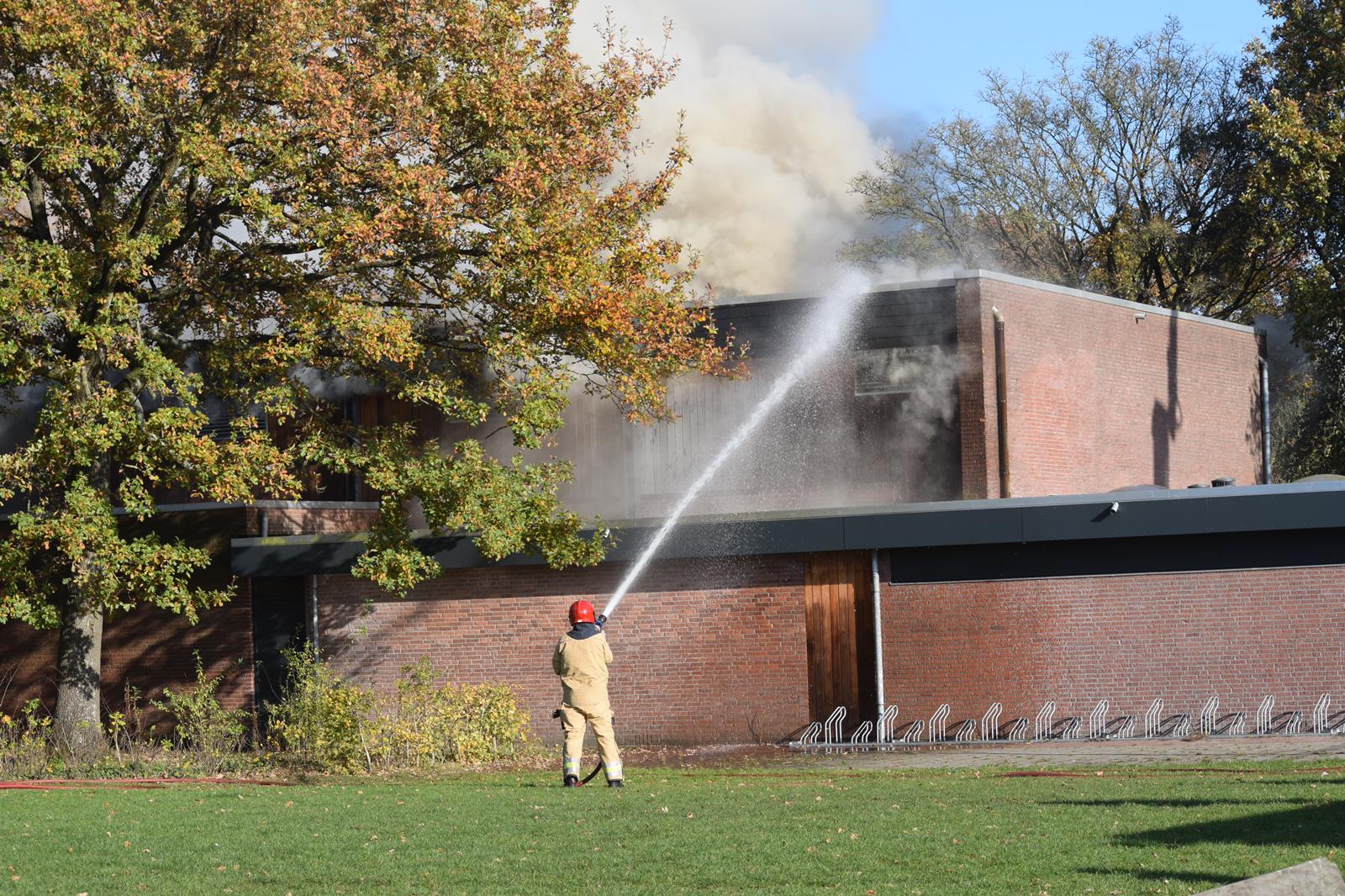 De brand leek onder controle maar laait opnieuw op. “De vlammen slaan nu uit een bijgebouw dat aan de gymzaal vastzit, vermoedelijk zijn dat de kleedkamers. Ook is er een nieuwe vuurhaard op het dak.”