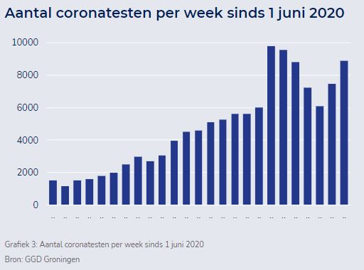 In de afgelopen week werden er 8.879 mensen getest in de coronatestlocaties van de GGD in Groningen. Van hen bleken 550 positief te testen. Dit komt neer op 6,2 procent. Dit is een toename van het vindpercentage met 1 procent ten opzichte van de week er voor.