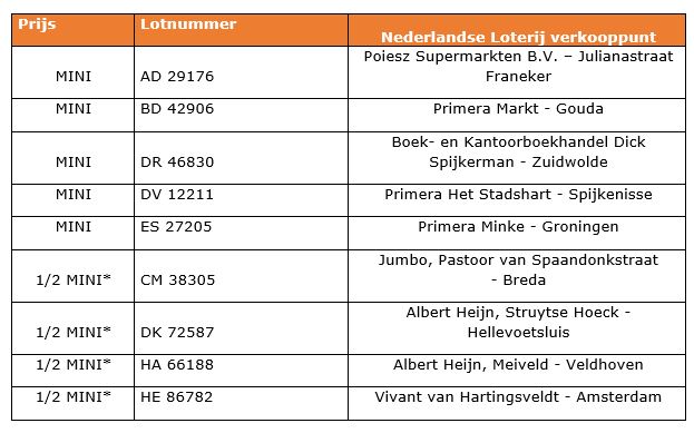 Het winnende nummer van het lot dat in de winkel van Primera Minke in Groningen werd verkocht is ES 27205. De winnaar heeft tot 31 december de tijd om zijn prijs op te halen. Om een prijs op te halen, moet de winnaar zich met het Staatslot melden bij een verkooppunt van Nederlandse Loterij, waarvan Staatsloterij onderdeel van is.