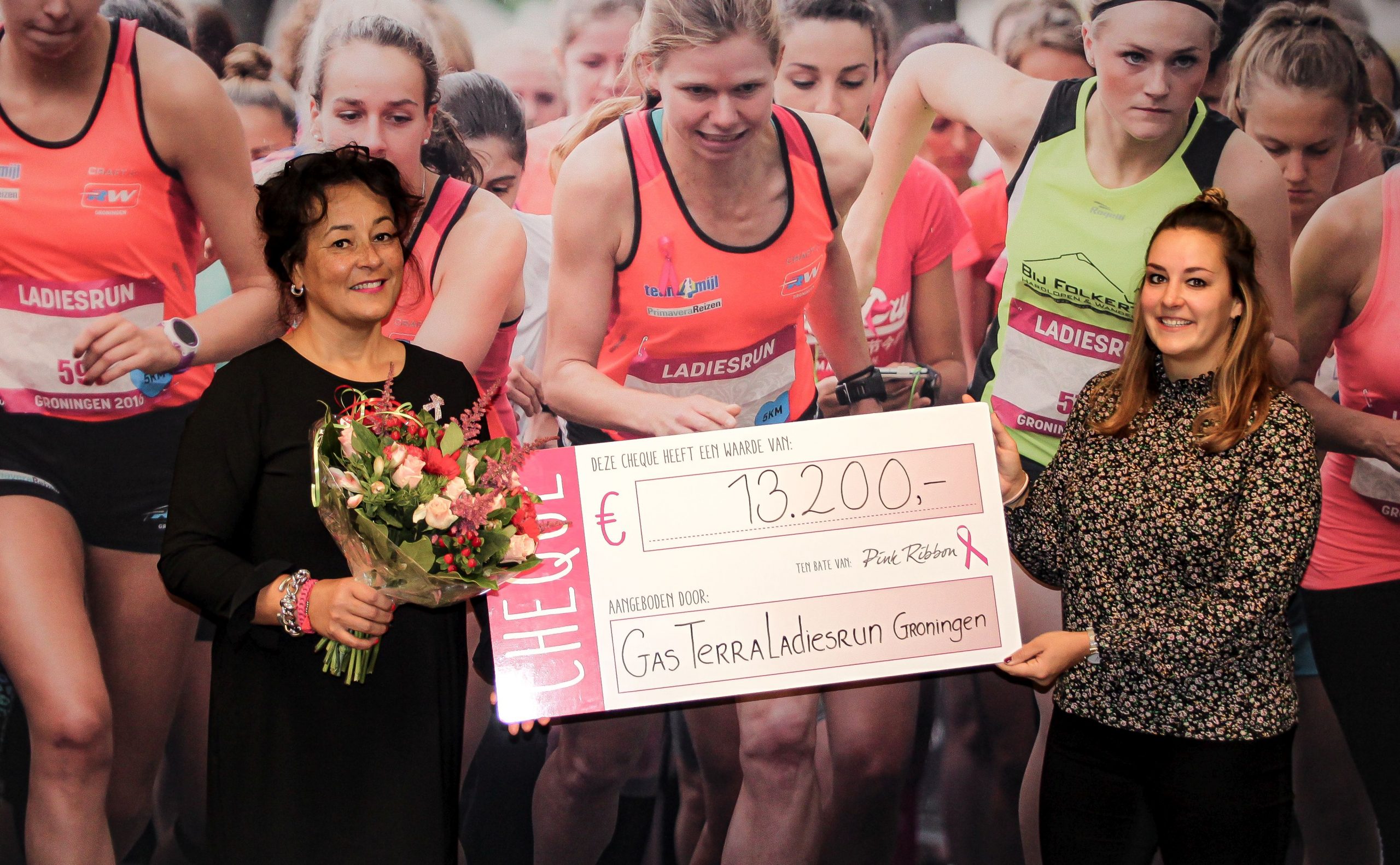 Grace Bregman, ambassadeur van Pink Ribbon, nam vanochtend uit handen van Michelle Mencke, projectmanager GasTerra Ladiesrun Groningen, de cheque in ontvangst. Deelneemster Suzanne Grondsma blonk uit en haalde met haar actie meer dan 3.500 euro op. Een half jaar geleden werd er bij Suzanne, op 34-jarige leeftijd, borstkanker geconstateerd en onderging daarom twee operaties, twaalf chemokuren en vijftien bestralingen.