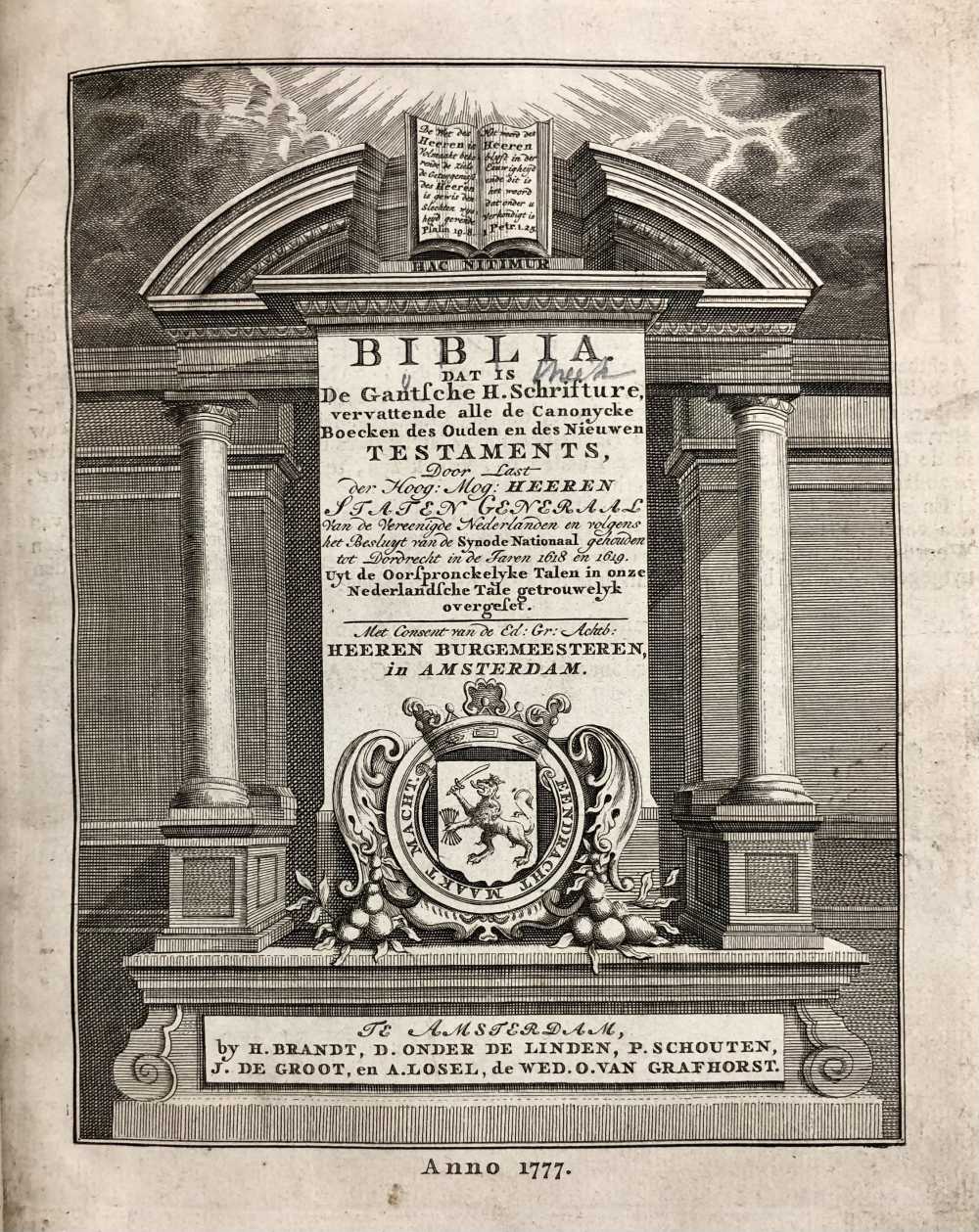 Het convoluut bevat drie verschillende edities van de bijbel: De gantsche H. Schrifture, vervattende alle de canonycke boecken des Ouden en des Nieuwen Testaments (Amsterdam 1777), de prophetien der propheten, en Het Nieuwe Testament, ofte Alle boeken des Nieuwen Verbondts onses heeren Jesu Christi (Amsterdam 1774) en het boek der psalmen, nevens de gezangen bij de Hervormde Kerk van Nederland in gebruik (Amsterdam 1774).