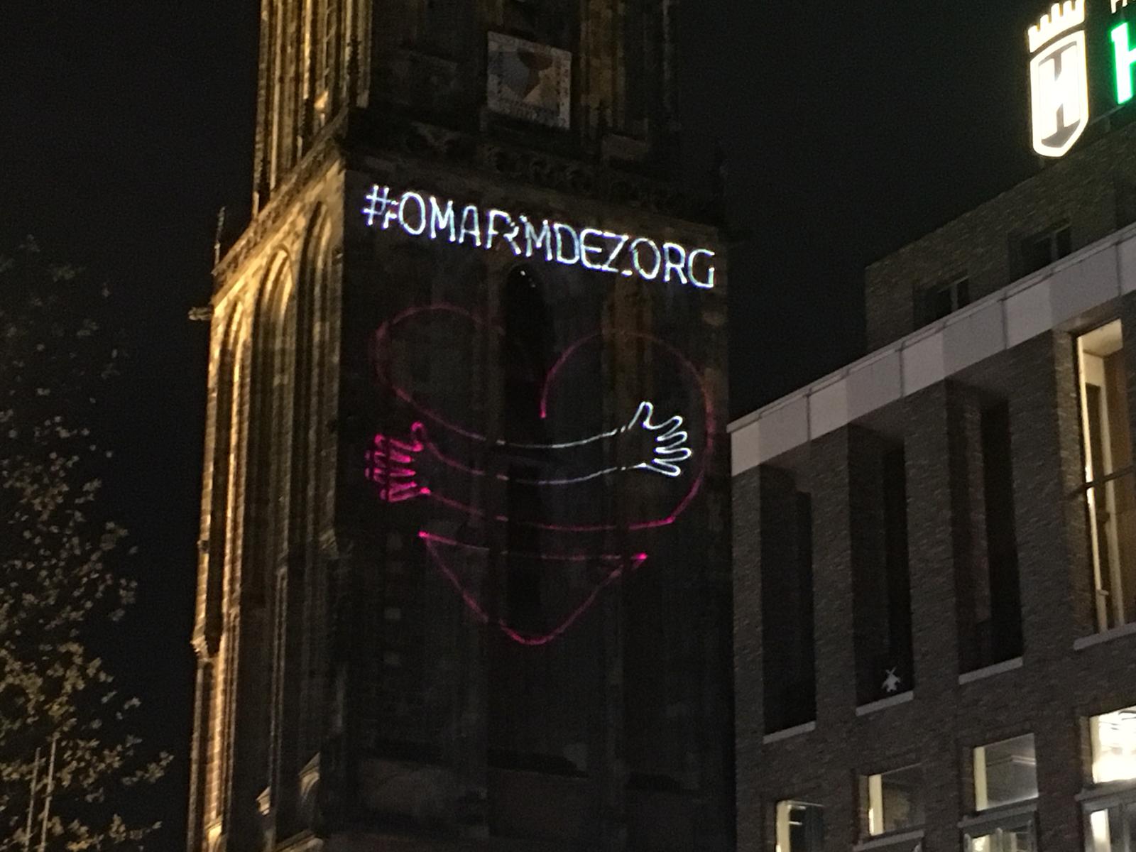 De projectie was de start van de online-campagne omarm de zorg. “Het is een landelijke actie”, vertelt Camara van der Spoel van vakbond FNV. “Behalve hier in Groningen worden er ook harten geprojecteerd op gebouwen in Eindhoven, Den Bosch en Den Haag. Met deze campagne roepen we alle Nederlanders op om achter onze oproep aan het kabinet te gaan staan om de salarissen in de zorg structureel te verhogen. Dus niet een eenmalige zorgbonus, die we overigens iedereen gunnen, maar echt een structurele salarisverhoging. Ook omdat de lonen in de zorg achter lopen in vergelijking met andere sectoren. Op die manier wordt het ook een aantrekkelijke sector waar mensen in willen werken.”