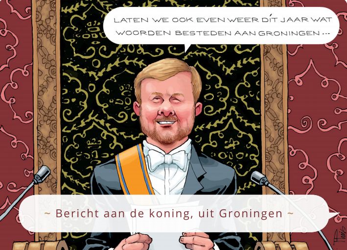 Een cartoon van Eric van der Wal (Pluis) siert de voorkant van de kaart. Deze stelt de koning voor die de troonrede voorleest: “Laten we ook even weer dit jaar wat woorden besteden aan Groningen”. Op de achterkant van de ansichtkaart kunnen Groningers een persoonlijk wens schrijven voor de vorst.