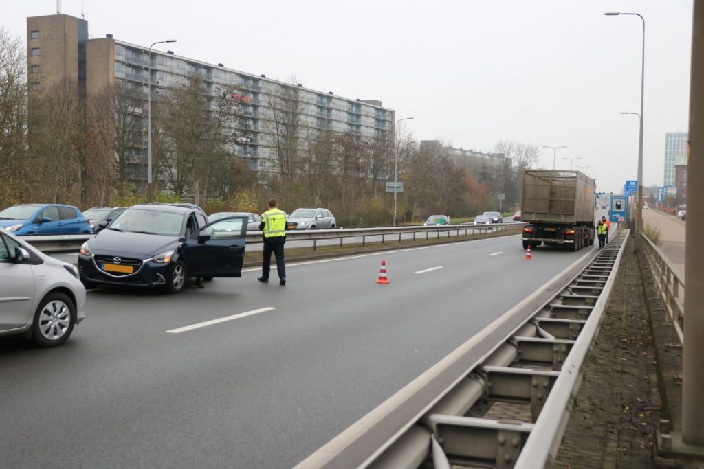 Het overige verkeer ondervond behoorlijk wat hinder. “Men moet zigzaggend passeren. De auto staat op de linkerrijstrook, de vrachtwagen op de rechterrijstrook, dus het zorgt voor enige hinder.” Rond 13.15 uur kon de vrachtwagen de weg vervolgen. Deze raakte nauwelijks beschadigd. De personenauto is weggesleept door een bergingsbedrijf. De politie doet onderzoek naar de precieze toedracht.