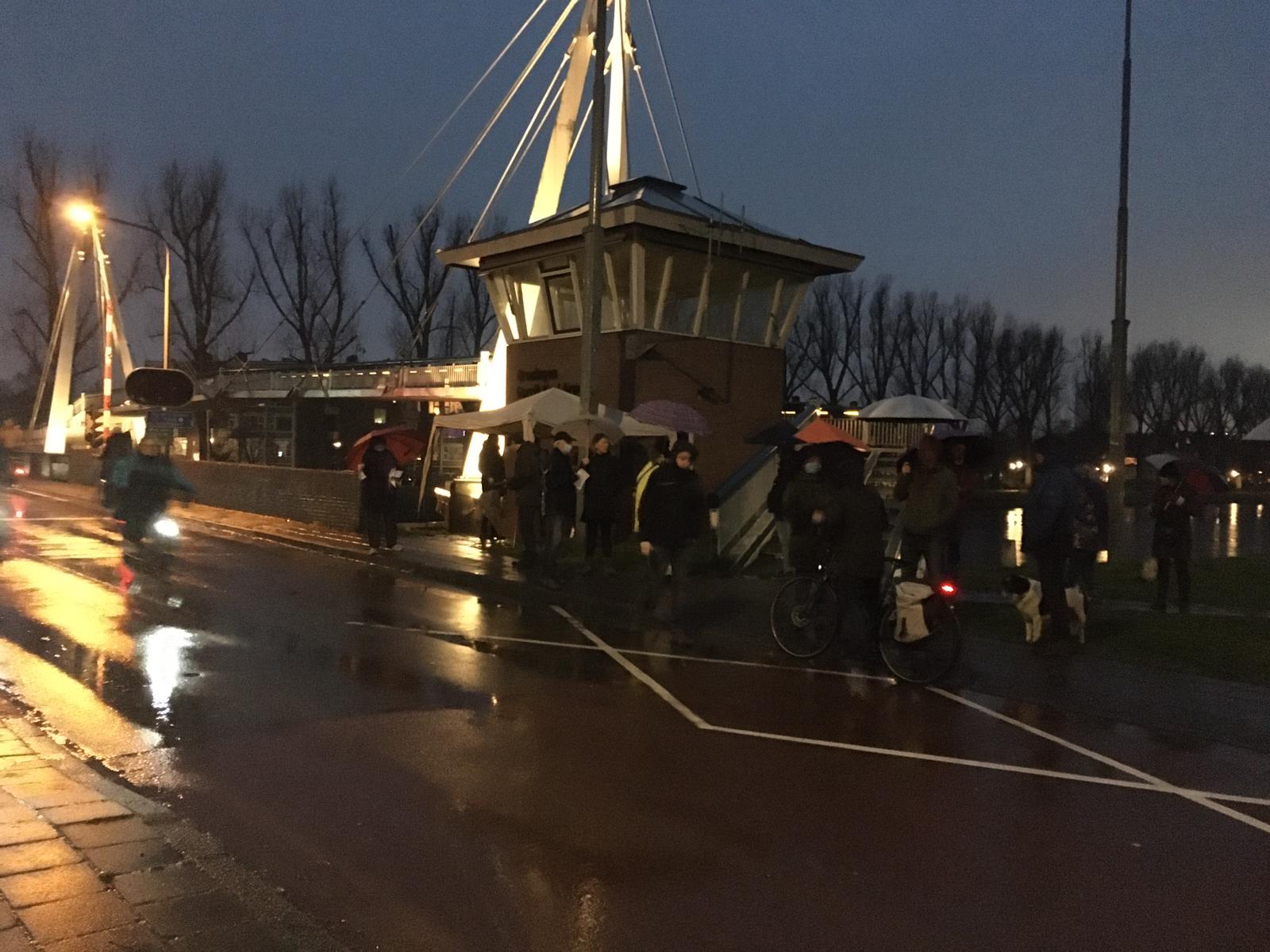 “We staan hier omdat vandaag de Tweede Kamer Commissie van Infrastructuur gaat vergaderen”, vertelt Maria Hintzbergen van het comité. “Zoals je misschien weet heeft de minister besloten om een lage variant van de nieuwe brug niet uit te werken. Dat is erg teleurstellend. Onze hoop is nu gericht op de Tweede Kamer dat zij de minister over gaan halen dat dit toch nog gaat gebeuren. Als hier een hoge brug komt dan gaat dat een soort van barrière worden voor 15.000 fietsers die hier dagelijks langs komen. Het is de drukste fietsroute van Nederland en daar wil je dan een onneembare brug neerleggen terwijl er maar dertig boten langs varen. Dat vinden we een hele scheve verhouding.” Volgens het lid krijgt men maandagochtend veel positieve reacties van voorbijgangers.