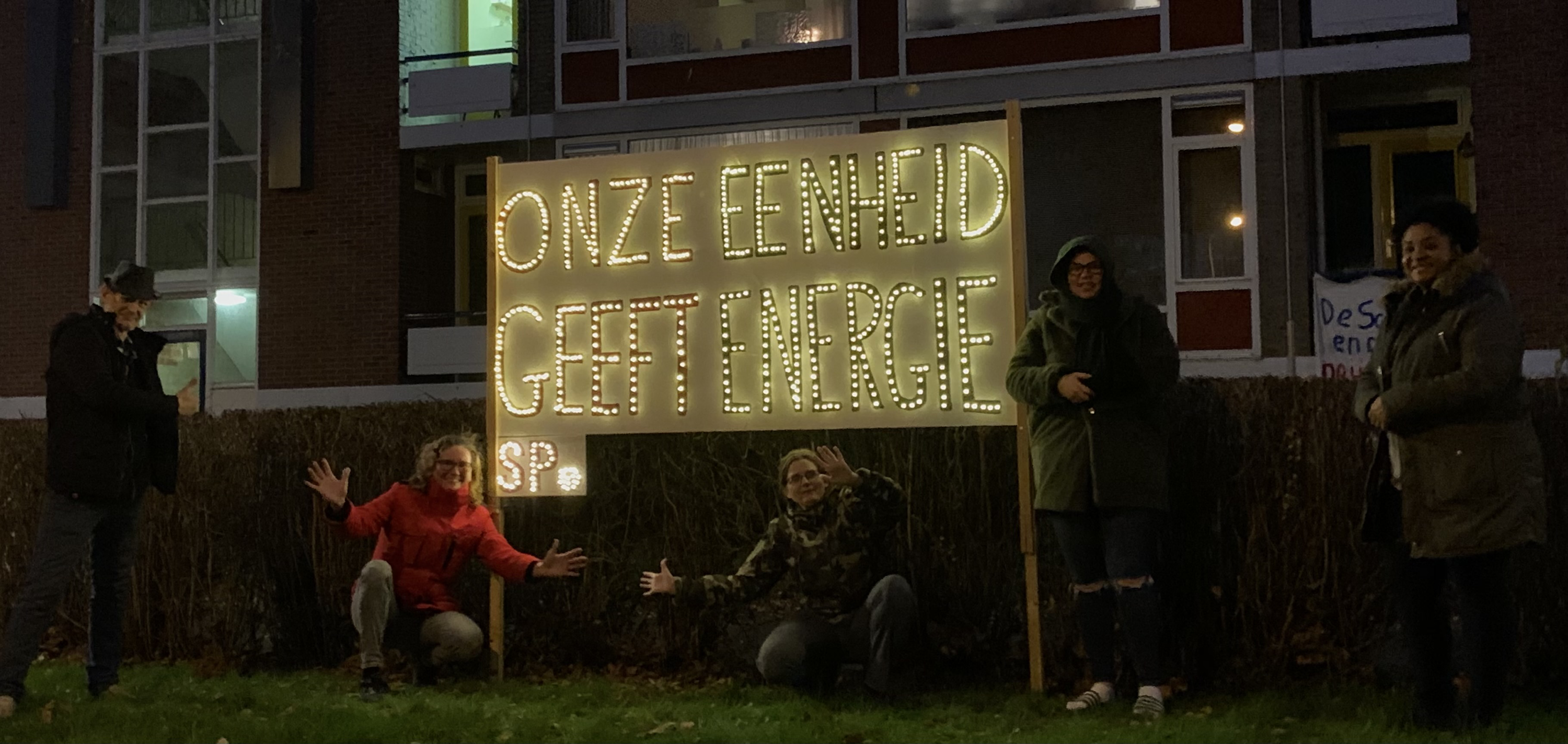 Huurders van woningen aan de Iepenlaan en Lijsterbeslaan geven met een lichtgevend spandoek aan dat hun strijd voor lagere woonlasten pas net begonnen is. Samen met de SP voeren zij actie.