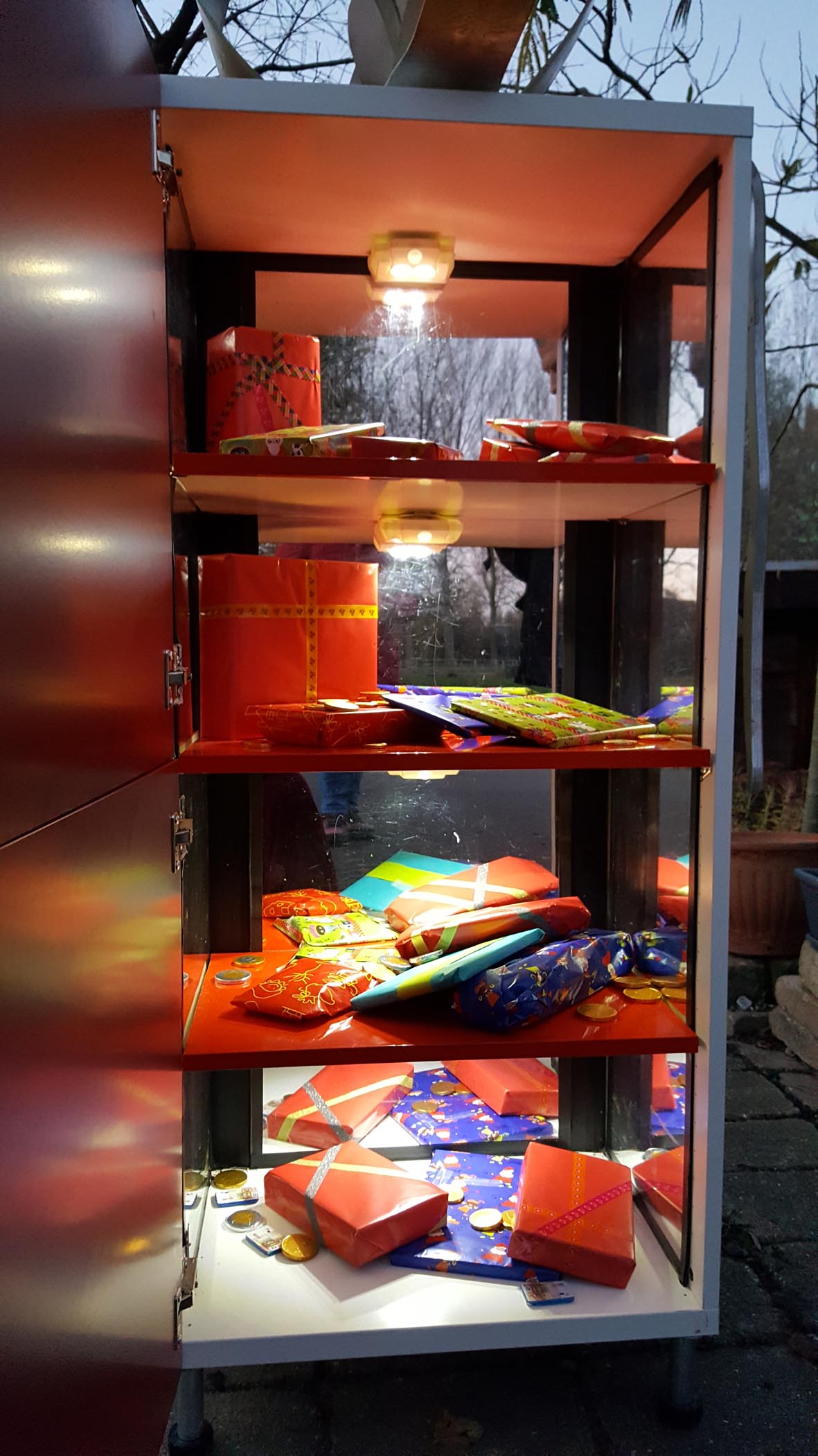Het initiatief voor de kastjes ontstond in 2011 bij twee buurvrouwen. Na een verhuizing staat het kastje nu in De Hunze. In het kastje liggen een aantal ingepakte Sinterklaascadeautjes. Mensen kunnen een ingepakt cadeautje in de kast leggen en een andere meenemen. De initiatiefnemers vragen de ruilers verder om de cadeautjes te voorzien van een gedichtje.